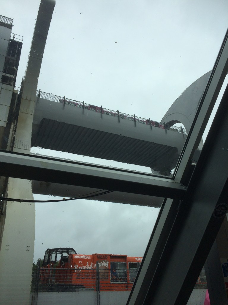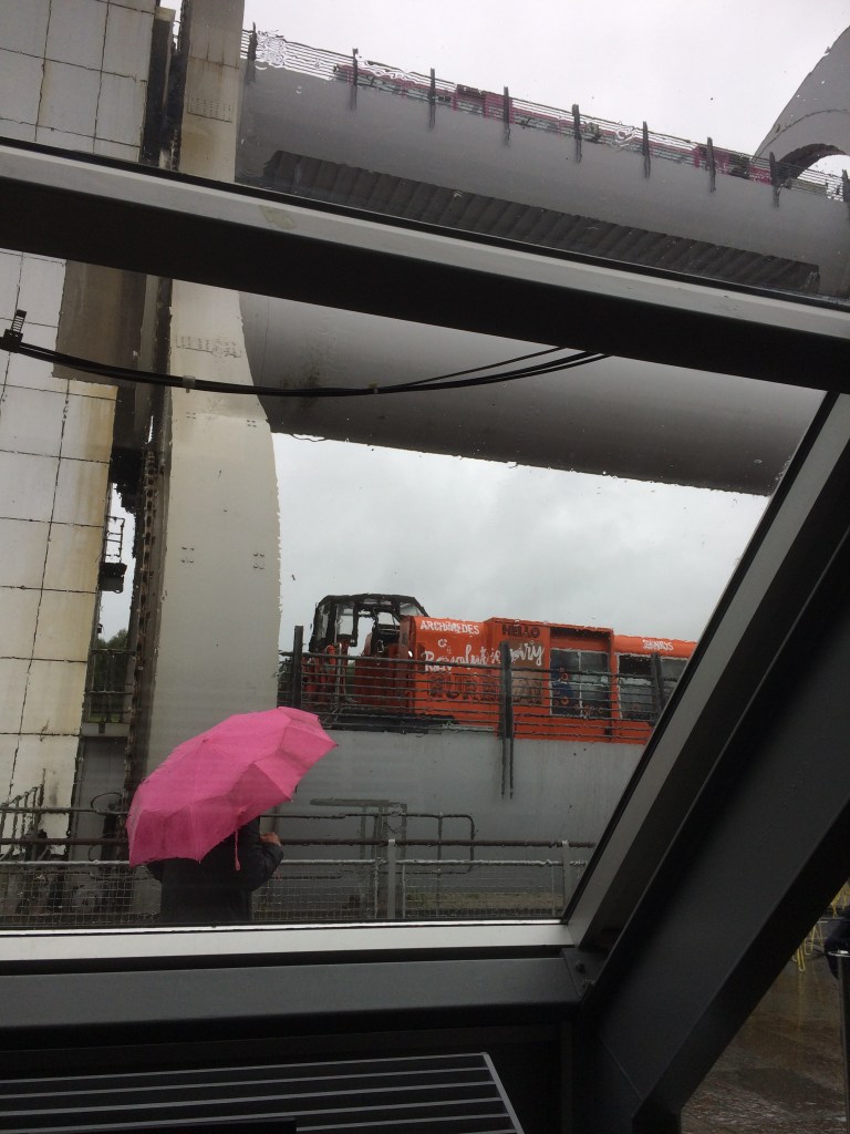 The day we visited was very wet, but in no way did it spoil viewing & enjoying this wonderful piece of machinery. It is a work of art and solves the simple challenge that all canals have, getting goods and people in their boats, down or up a hill. Traditionally the challenge is solved by a series of locks, but here the impressive engineering in the Falkirk Wheel lifts the barge and occupants, then gently deposits them to the upper or lower canal level as desired.