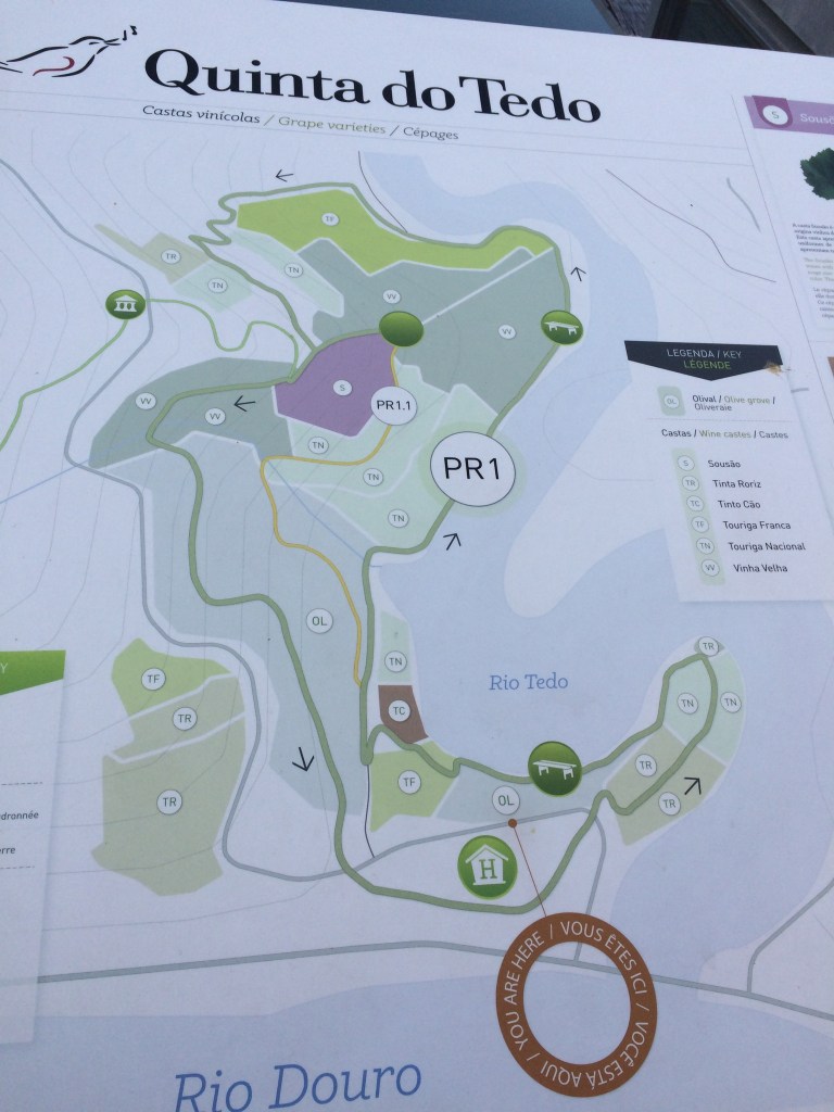 The map of the Quinta, see above right, shows the positioning of the Quinta and it’s vineyards nestled around the Tedo and Douro rivers. It’s not all about the views from every aspect of the Quinta, but the views are amazing. Views from the swimming pool, or the dining room or when out on a walk around the vineyard, accompanied by two beautiful dogs from the Quinta that just came along for the walk.