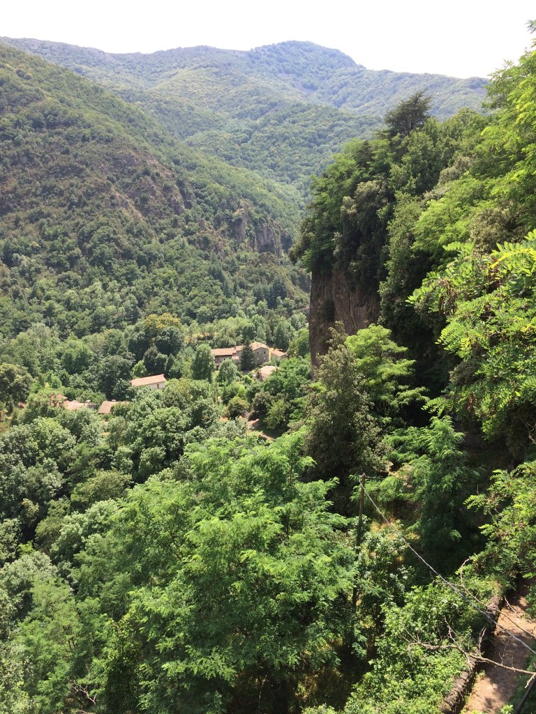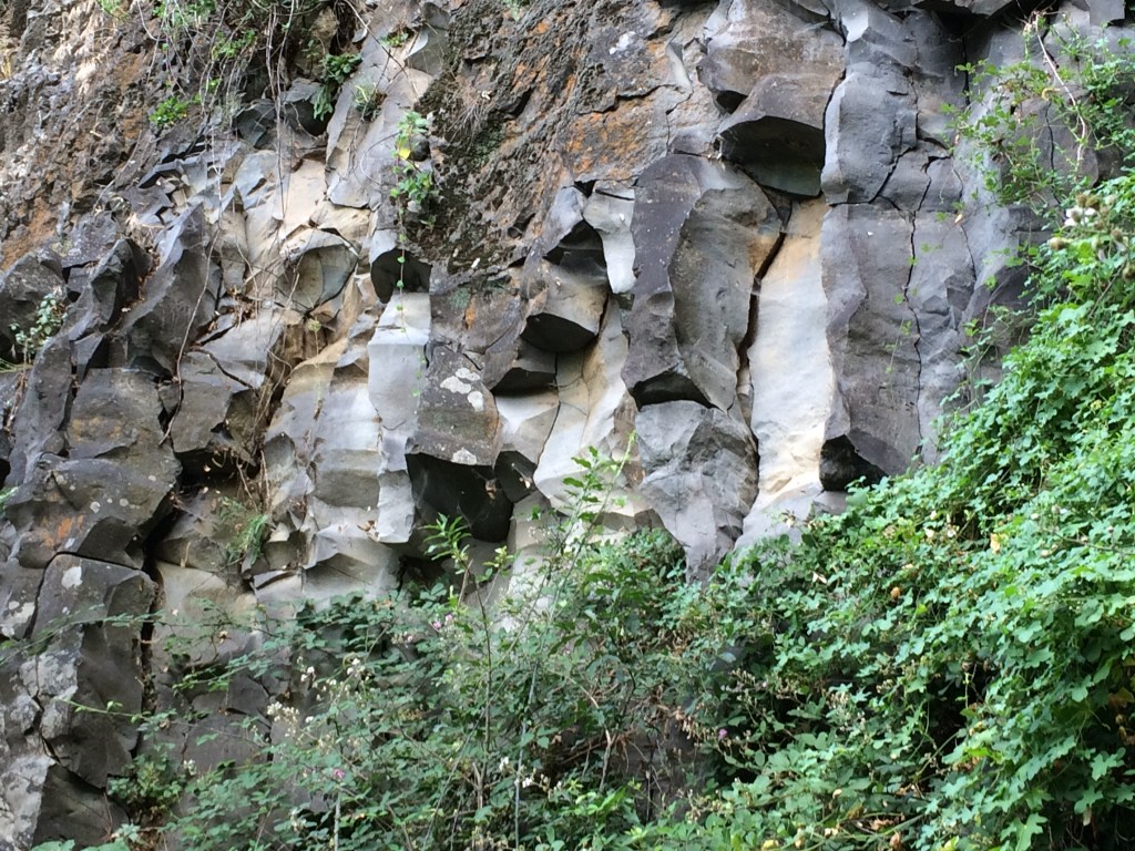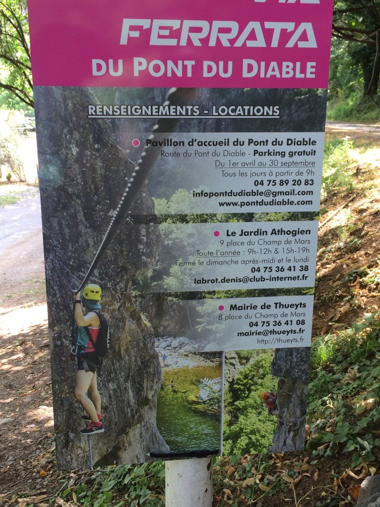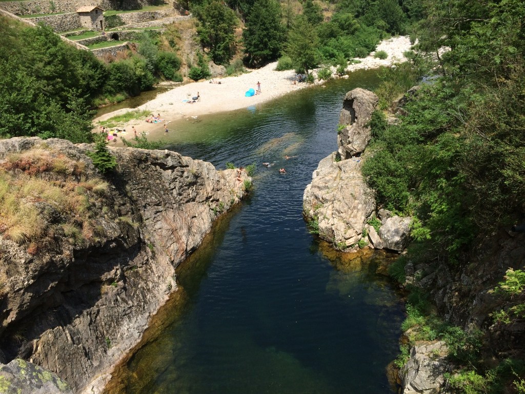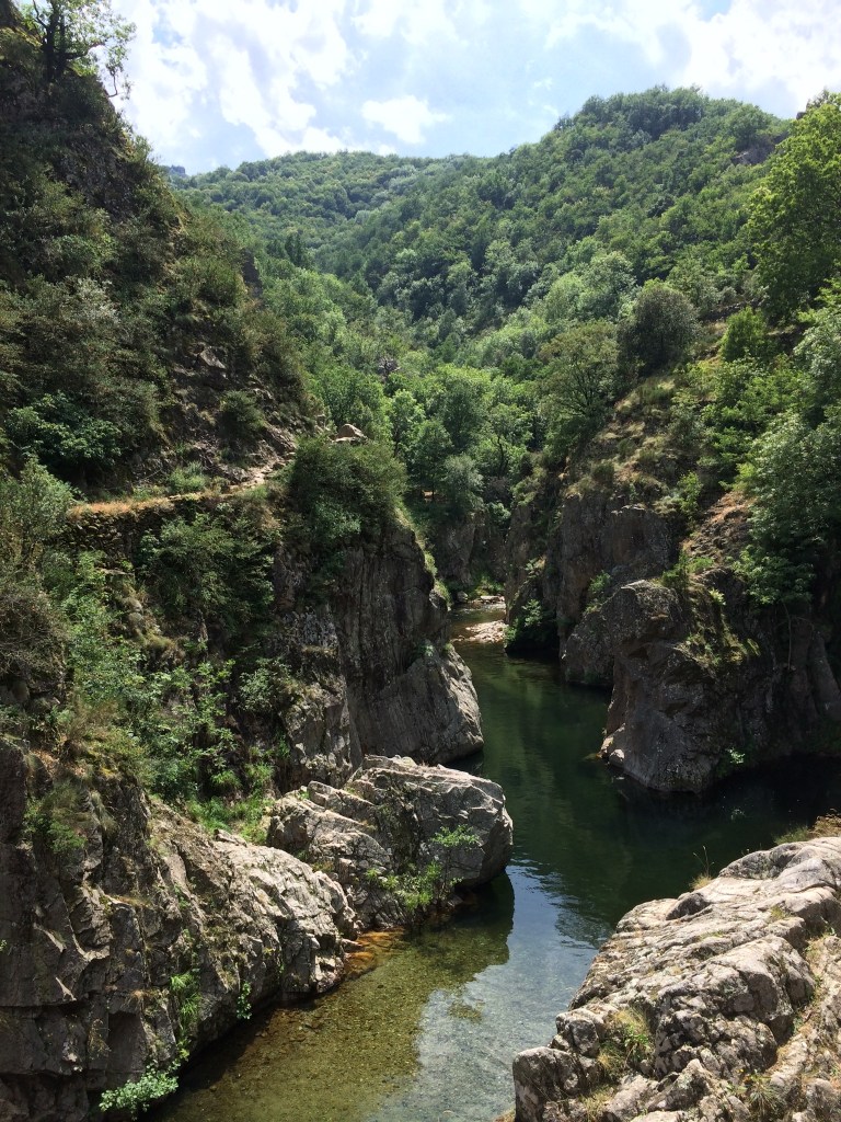 Thueyts provide good car parking and a number of routes down to the Pont du Diable. We chose to park up in the town and to take a slightly precipitous track down, past wonderful displays of basalt rock formation. There are a number of walks in this area, we chose to walk down, have a wonderful swim under the Pont, and to return the way we had come.