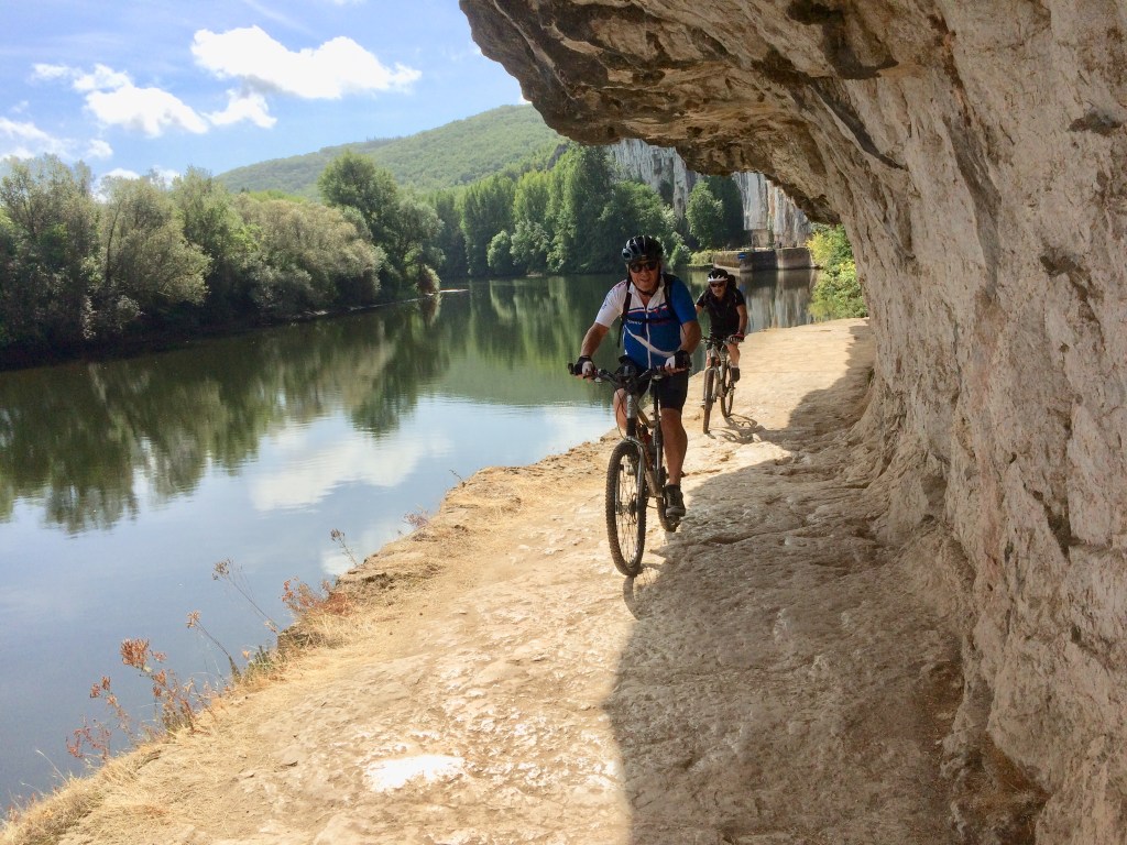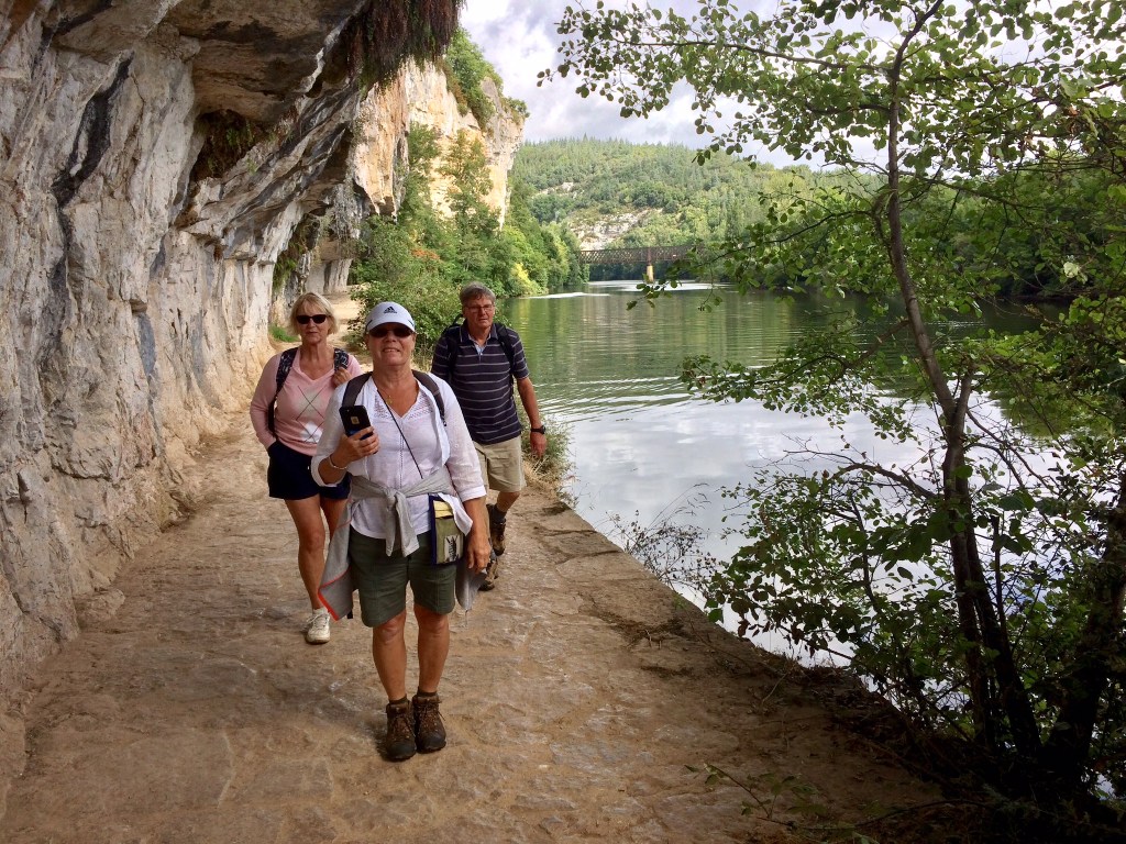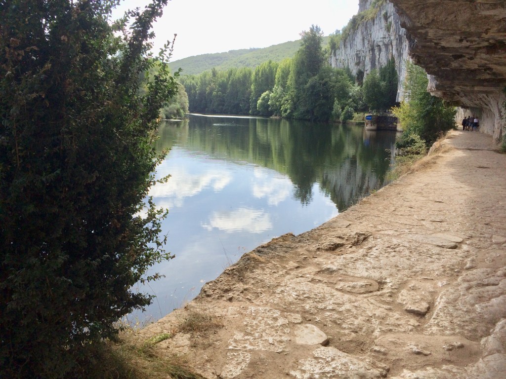 We parked at Bouziès , good parking by the river Lot, kids playground, access to leisure boats, great toilets, and then walked along the river bank – lovely wooded areas with sculptures. The path then comes to the rivers edge and as the pictures show above either uses a natural shelf in the limestone or one cut by man into it – probably a combo of the two. Anyway it’s pretty impressive not just as access but as a viewing point to the valley.