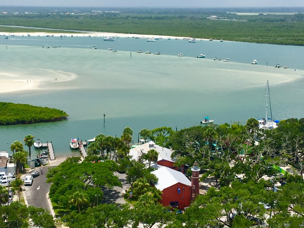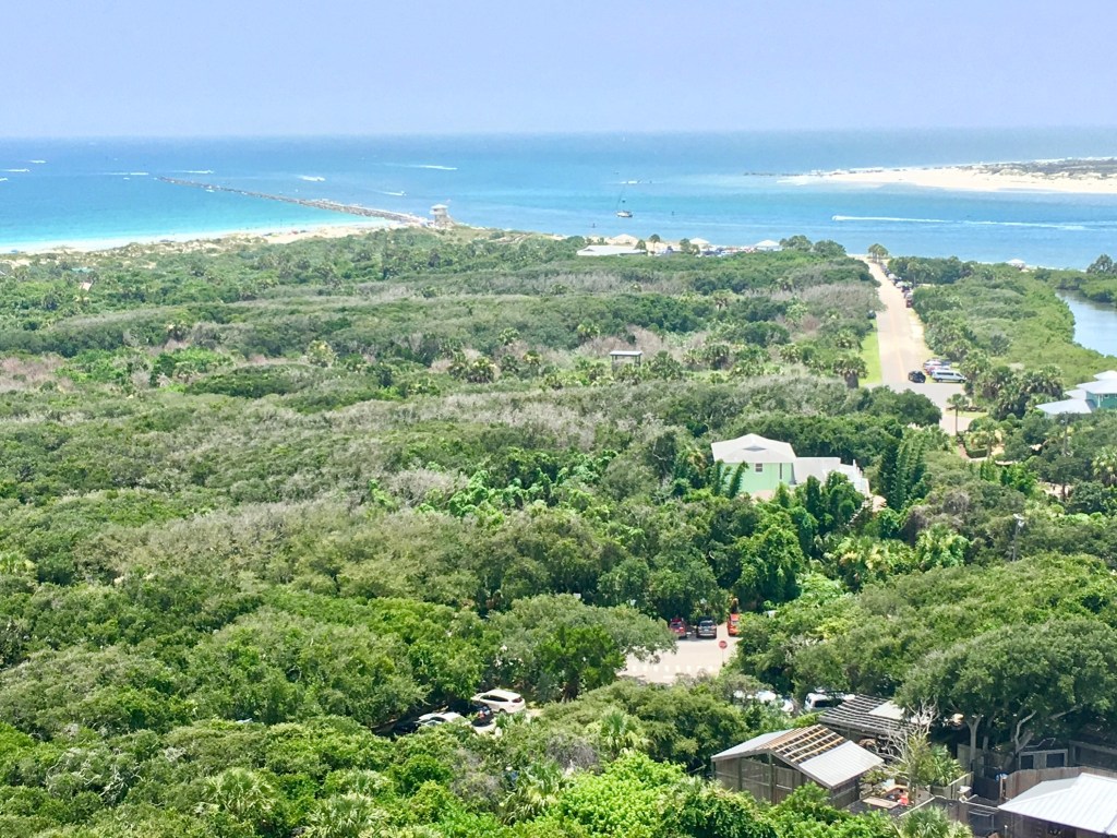 The view from the lighthouse also shows the The Intracoastal Waterway (ICW) . “This is a 3,000-mile (4,800 km) inland navigable waterway from the Atlantic and Gulf of Mexico coasts of the United States, running from Boston, Massachusetts, southward along the Atlantic Seaboard and around the southern tip of Florida, then following the Gulf Coast to Brownsville, Texas. Some sections of the waterway consist of natural inlets, saltwater rivers, bays, and sounds, while others are artificial canals. ( Thanks Wikipedia).