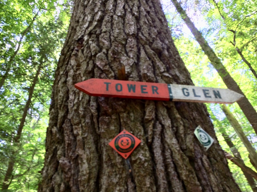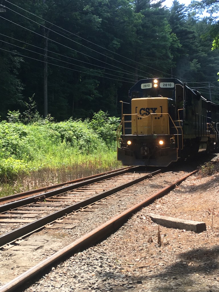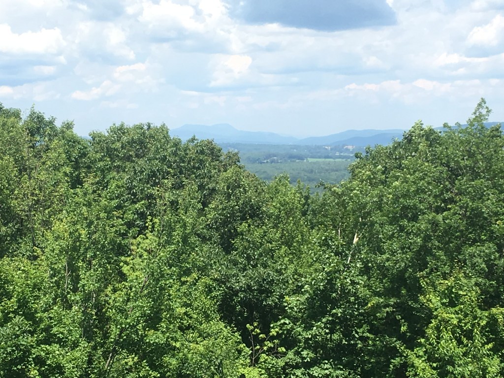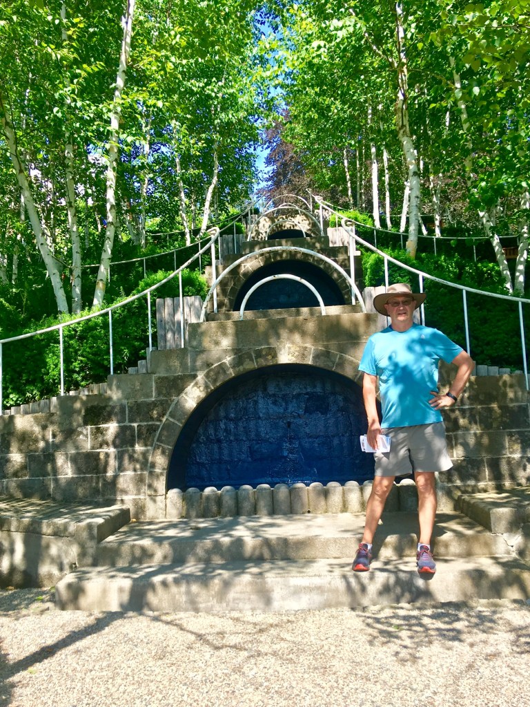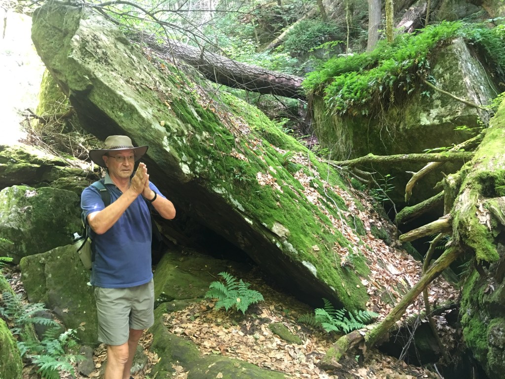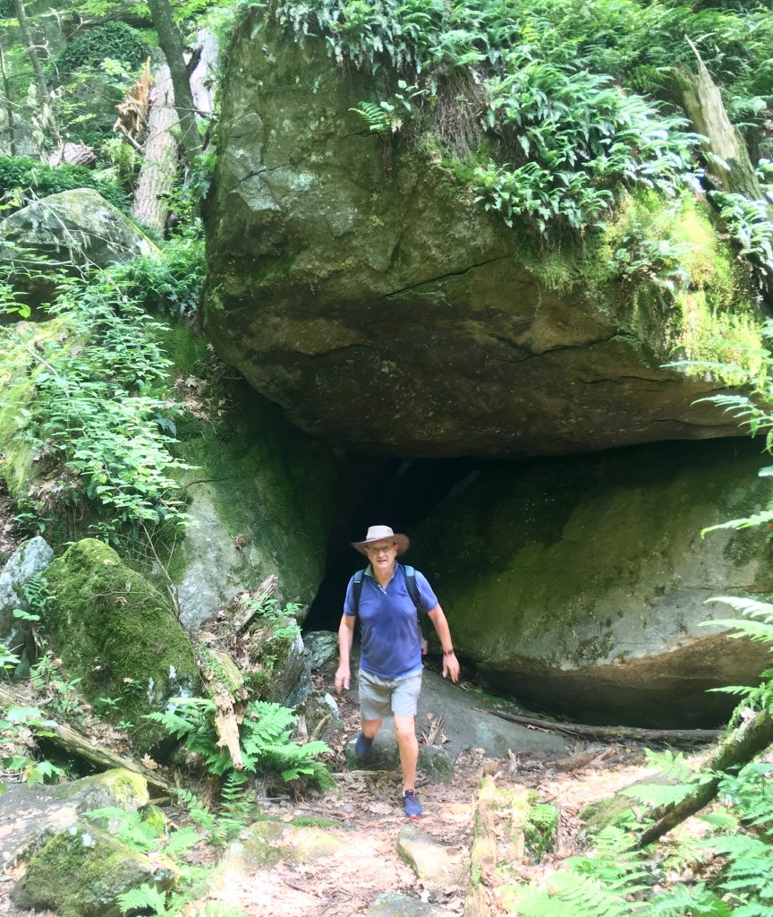 We opted for a couple of walks to explore the woodlands, from Park Street Stockbridge up a hill, 600 feet of elevation and 3km to Laura’s Tower, then the next day a lower level walk to the Ice Glade and some wonderful glacier deposited boulders, rocks and cooling wafts of air from the depths. The walks were not super well signposted but we found our way there and back without too many problems. From the shady car park, across the river, over the train tracks and into the woods. Returning from the Laura Tower walk we heard a train approaching and arrived at the tracks in time for the view and sounds as the driver sounded that familiar, “ wail”, from so many American railroad movies!