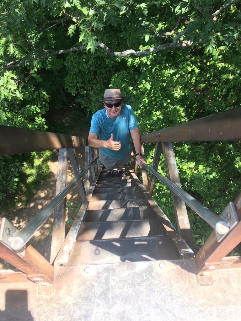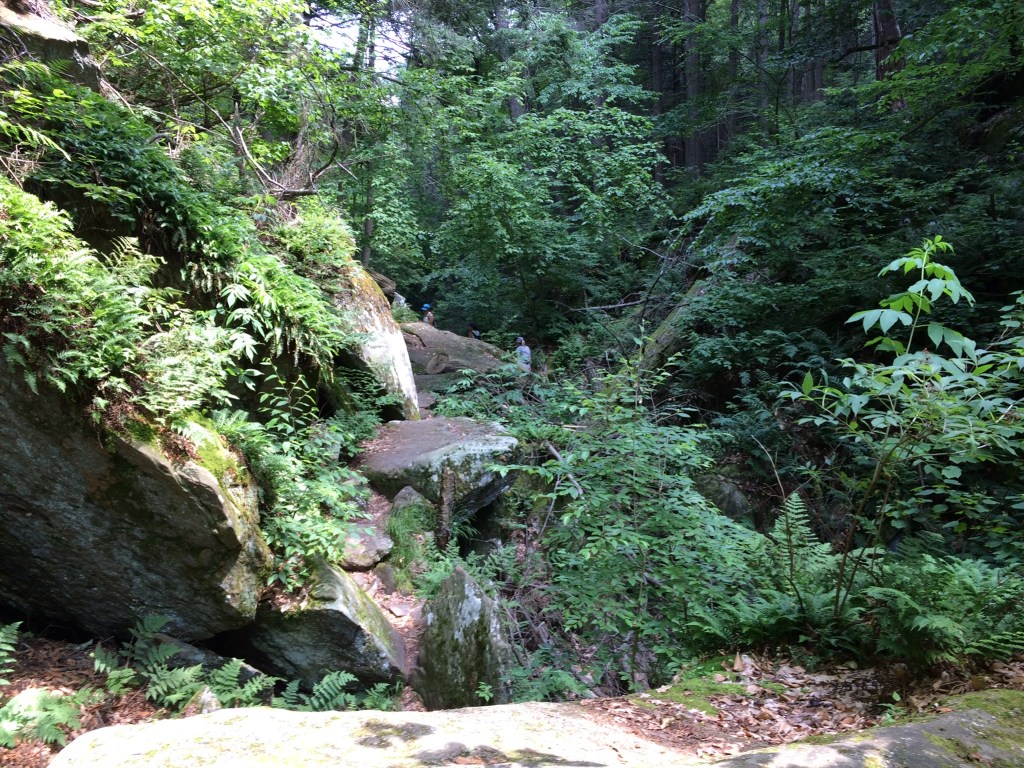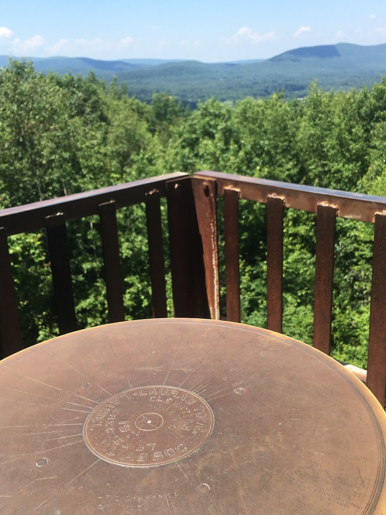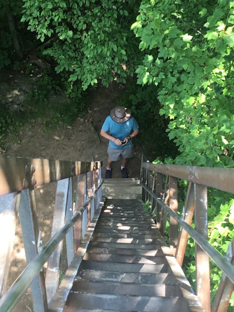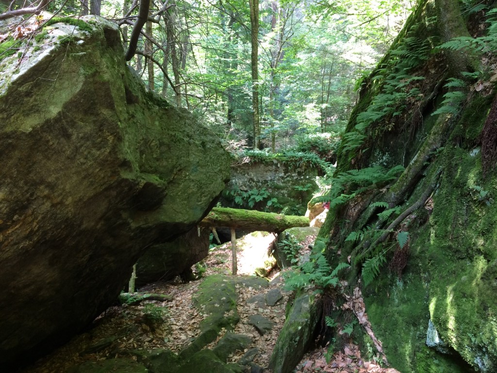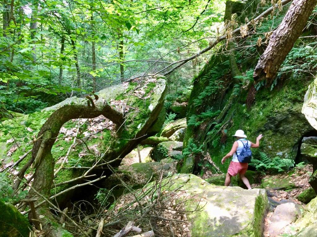 We opted for a couple of walks to explore the woodlands, from Park Street Stockbridge up a hill, 600 feet of elevation and 3km to Laura’s Tower, then the next day a lower level walk to the Ice Glade and some wonderful glacier deposited boulders, rocks and cooling wafts of air from the depths. The walks were not super well signposted but we found our way there and back without too many problems. From the shady car park, across the river, over the train tracks and into the woods. Returning from the Laura Tower walk we heard a train approaching and arrived at the tracks in time for the view and sounds as the driver sounded that familiar, “ wail”, from so many American railroad movies!