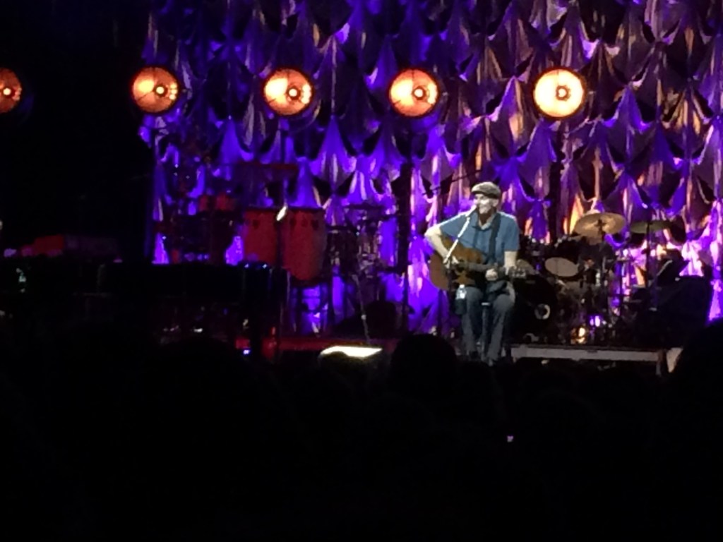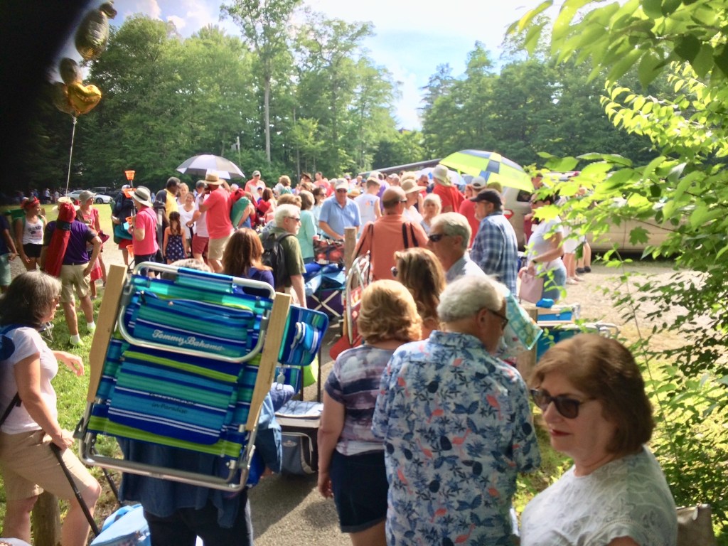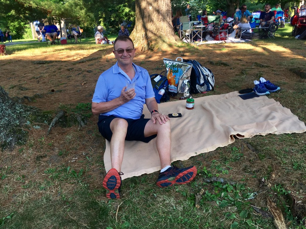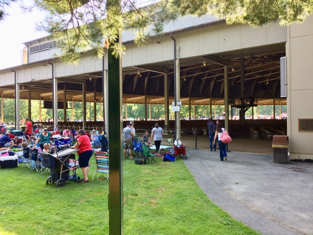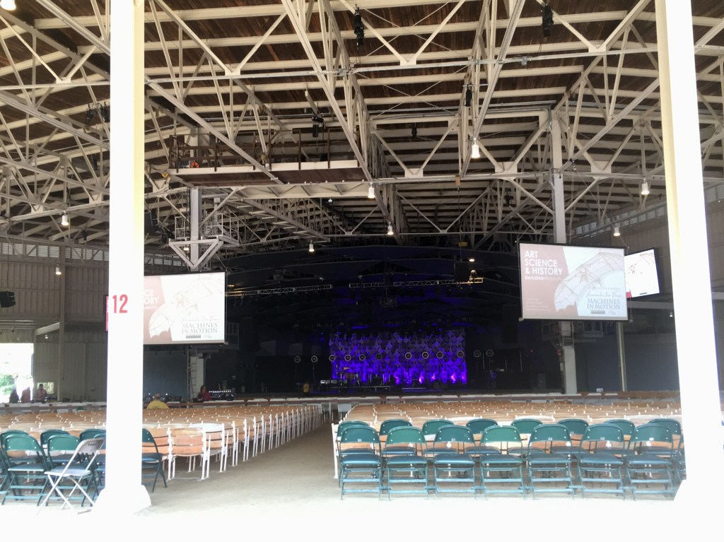 The venue is unique, it’s called “ The Shed”, is open at three sides to the surrounding lawns, trees and gardens it has a packed earthen floor. Overall imagine a two storey wedge of cheese with the pointed end the stage and 5000 seats fanning and gently elevating back from that. Another 13,000 concert goers are set out on the surrounding lawns with “ concert displayed big screens”, deckchairs, tables, shades, candlabras, food and drink !! It’s party time at Tanglewood with James Taylor who first performed there in 1974 and in 2019, aged 71 has a voice and enthusiasm as strong as ever in this his 27th year to appear.