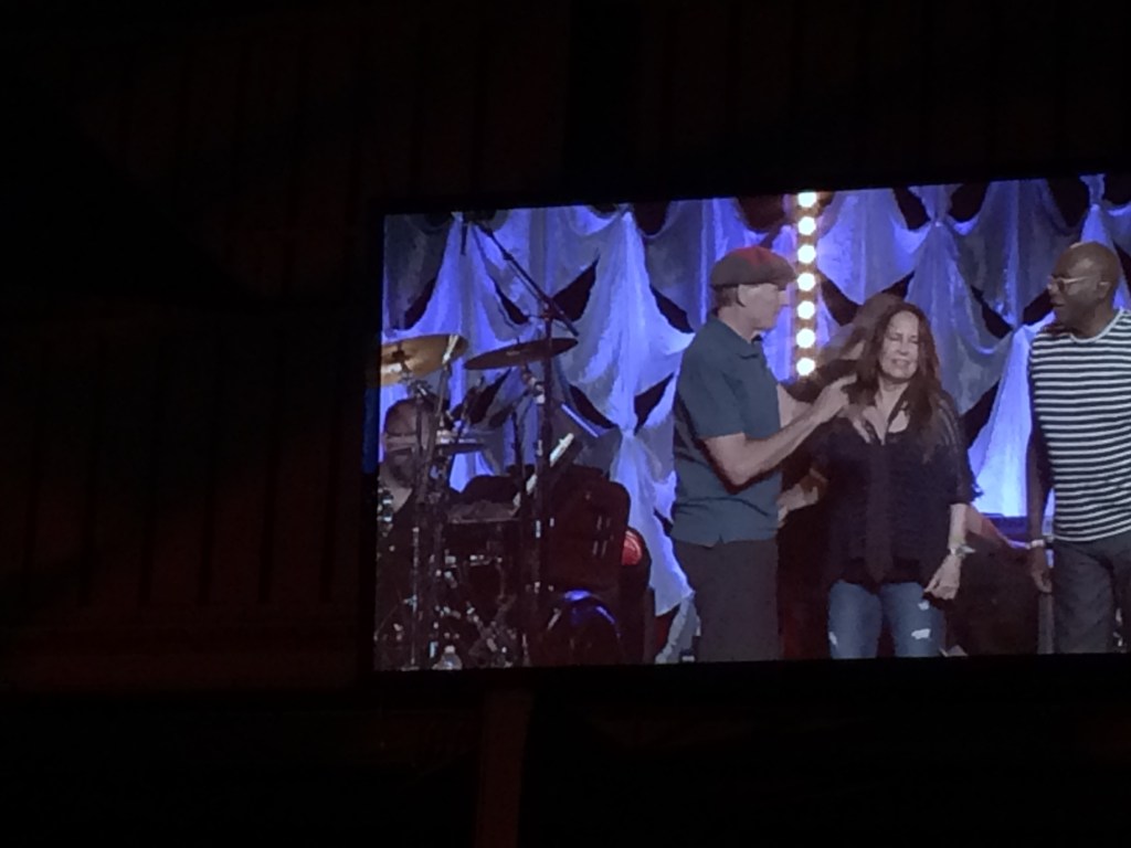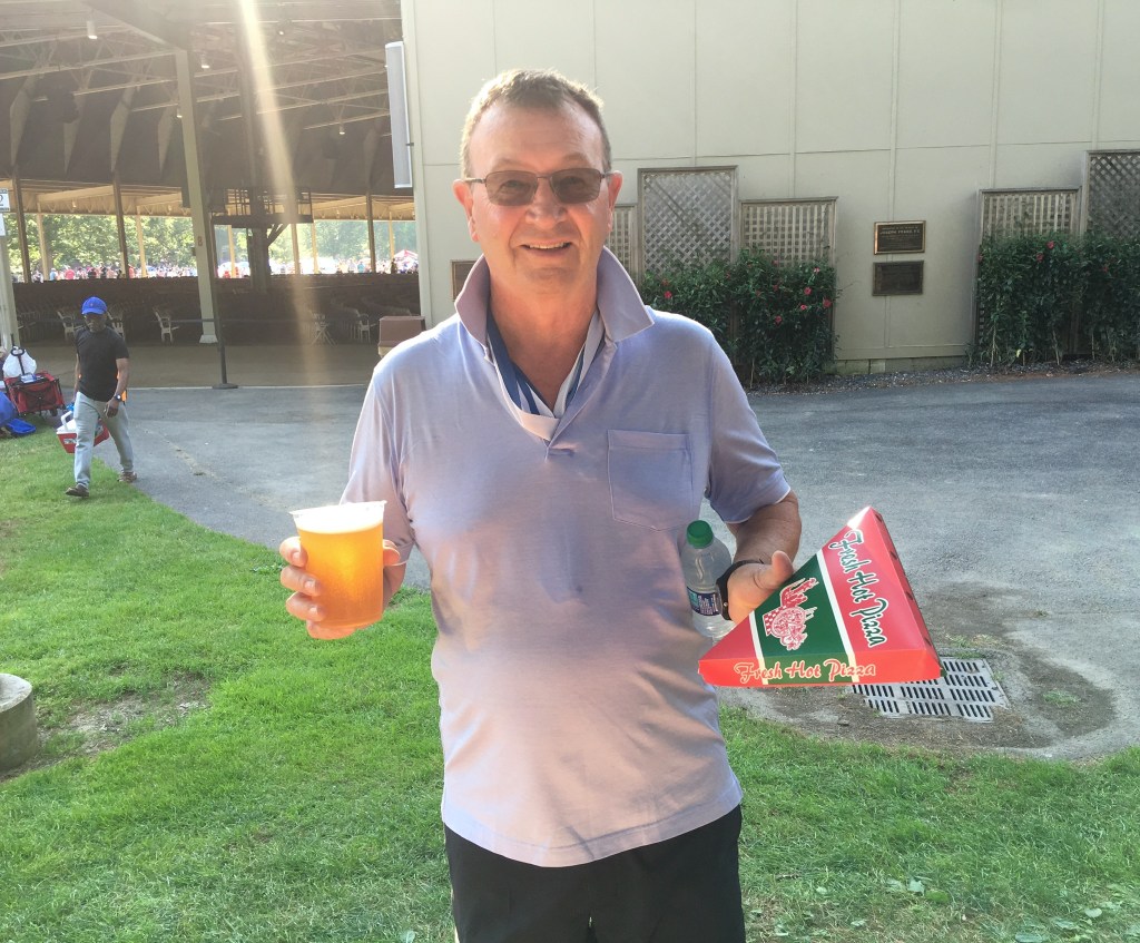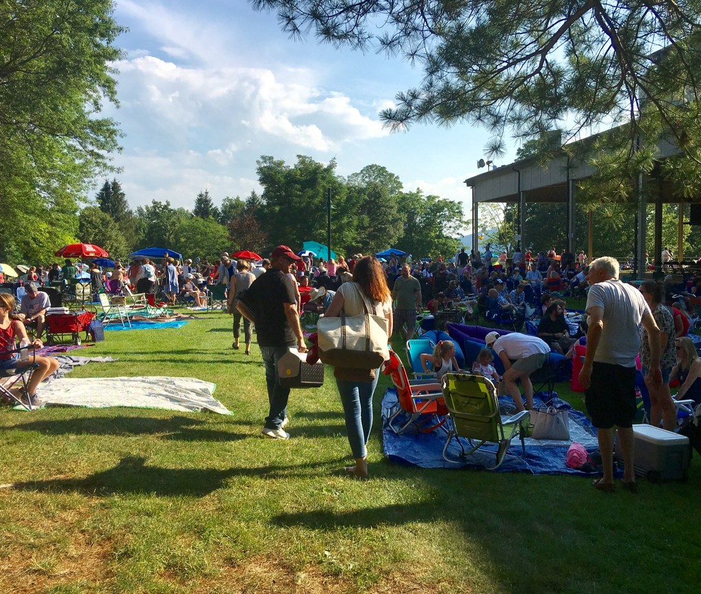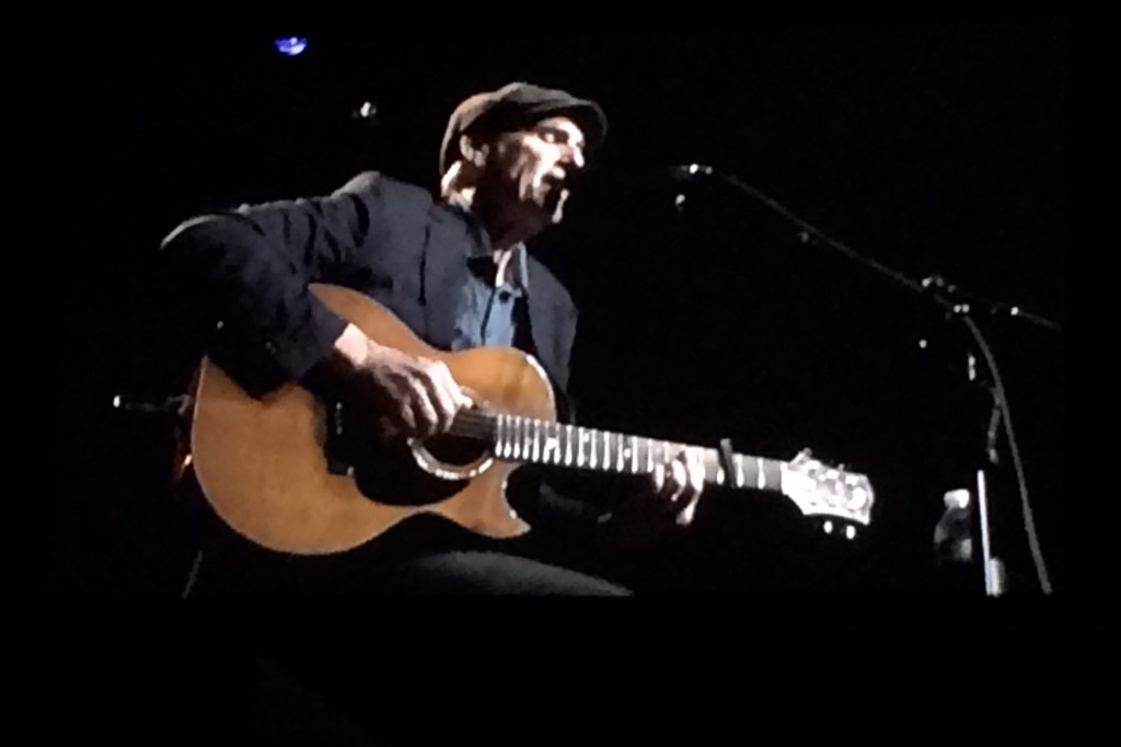 The venue is unique, it’s called “ The Shed”, is open at three sides to the surrounding lawns, trees and gardens it has a packed earthen floor. Overall imagine a two storey wedge of cheese with the pointed end the stage and 5000 seats fanning and gently elevating back from that. Another 13,000 concert goers are set out on the surrounding lawns with “ concert displayed big screens”, deckchairs, tables, shades, candlabras, food and drink !! It’s party time at Tanglewood with James Taylor who first performed there in 1974 and in 2019, aged 71 has a voice and enthusiasm as strong as ever in this his 27th year to appear.