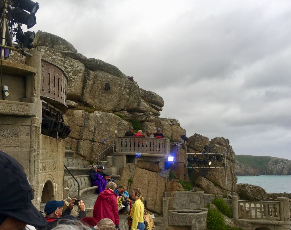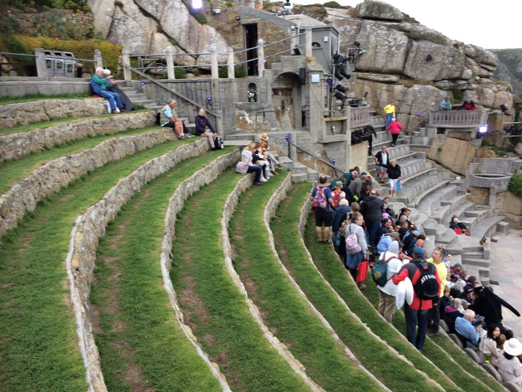 A few notes from our Minack visit, the grassy seats are more comfortable than the concrete ones, and we highly recommend the seat cushions. There are no “pre-numbered” seats, but if you buy seats towards the front you will be assured of hearing the actors. Plenty of room in the car park but getting there early and into the queue ensures a better seat close to the front.