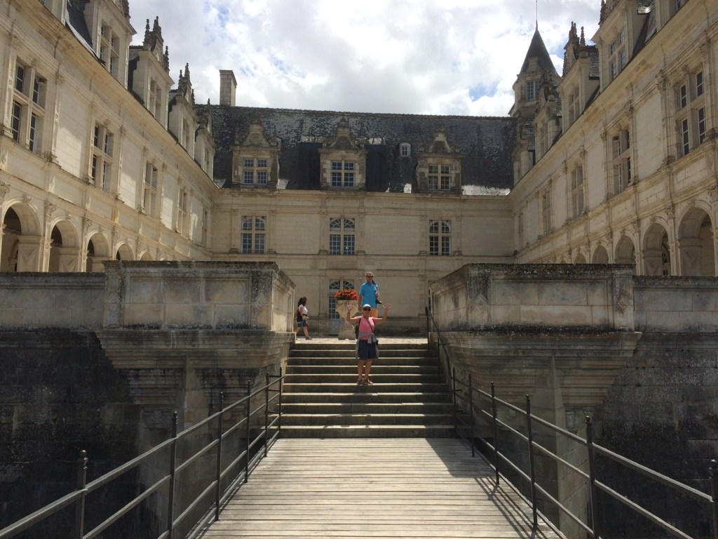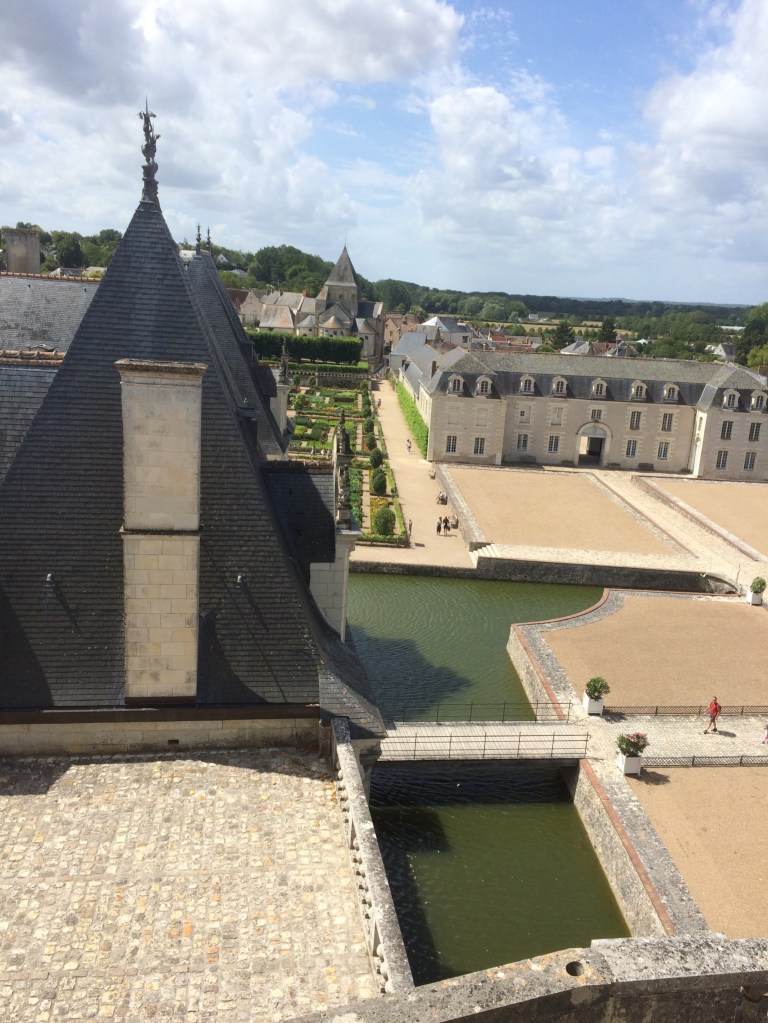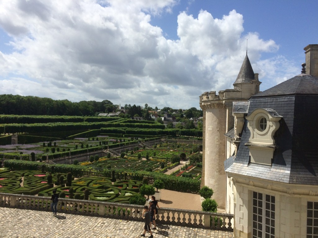 Villandry is really well organised. Great free car parking across the road from the Chateau entrance. Ticket Office to buy the tickets, get a nice map of the grounds, follow the signs and up a few internal stairs, maybe they are chestnut timber steps, do you think? And then we are up at the Bellevue, your Villandry Renaissance Garden tour vista is laid out before you and off we go.