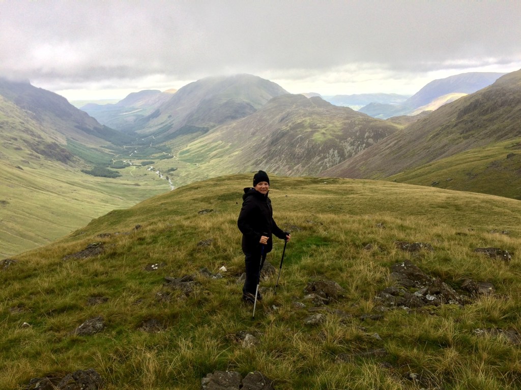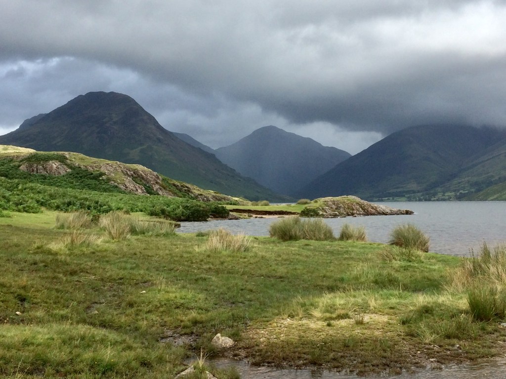 From Scarth Gap, we thought we remembered it was an easy scramble up onto a series of summits, called Haystacks. It wasn’t easy but it was fun, climbing and scrambling upwards with stunning views until we reached the tops and Innominate Tarn, where the ashes of ( AW) AlfredWainwright have been laid. For readers not familiar with AW, he has left a magnificent legacy of map work, drawings and writings on the Lake District and much more. The Coast to Coast walk referred to above was his brainchild, and he is much revered.