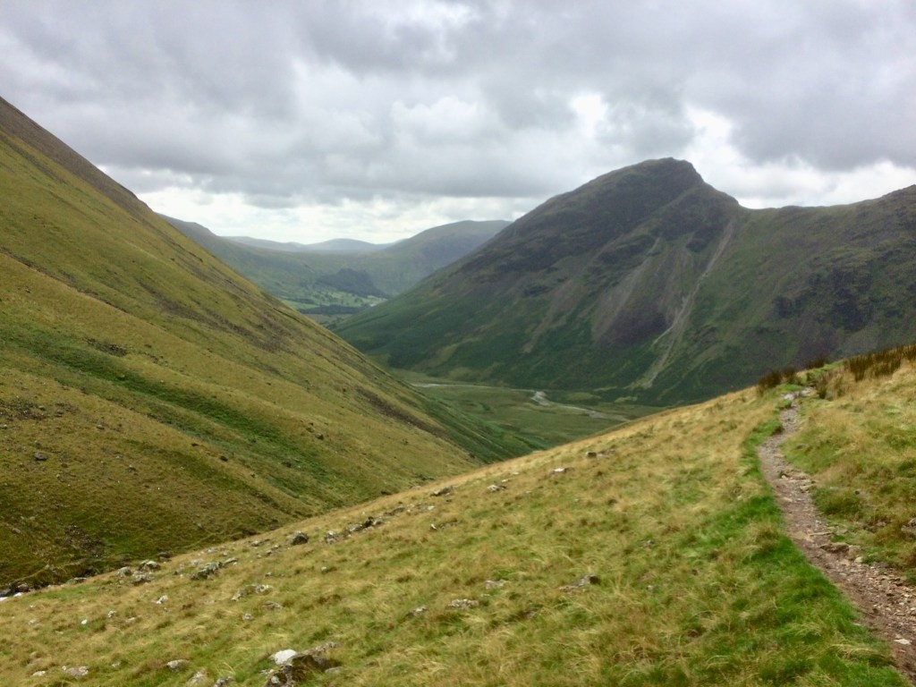 Having found Moses Trod, we followed and it cut under the tops of the mountains Brandreth & Green Gable and on to the top of the Ennerdale Valley ridge called The Tongue. Walking down the Tongue was great until the wind gusts threatened to knock us off our feet, but we persevered and headed down back to Black Sail YH. Towards the end you may on the pics be able to see small hillocks, these are “ drumlins” ie moraines left by the receding glacier.