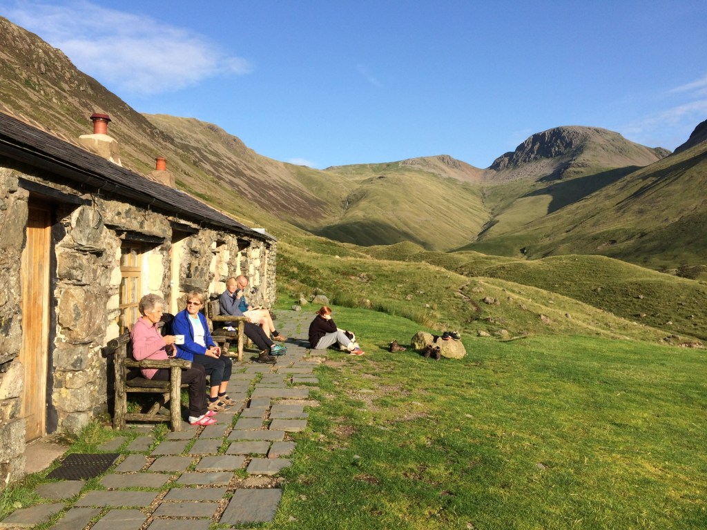 So what started as a windy wet, cold Day 1 outside the Wasdale Head Inn – our Monday night stop- ended in glorious Tuesday afternoon sunshine at Black Sail YH with a cold beer, and glass of wine!