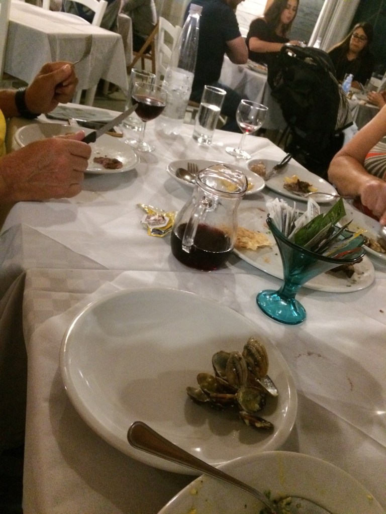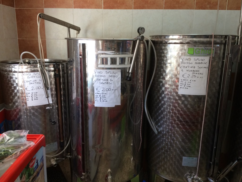 We ate at two village restaurants, brilliant inexpensive traditional Sardinian pastas, and purchased food at the local shop/ superette and local butcher. The superette was very modest, fresh vegetables – nothing pre- packaged – excellent range of cheeses, cooked meats and BYO container for the cheap local wine – see pic below. We also ate Lunch at two beach bars,similarly excellent. Local wines In restaurants very good & inexpensive, 1 litre of house red – mainly Carignan grape or Carbonneau- between €6 and €10.