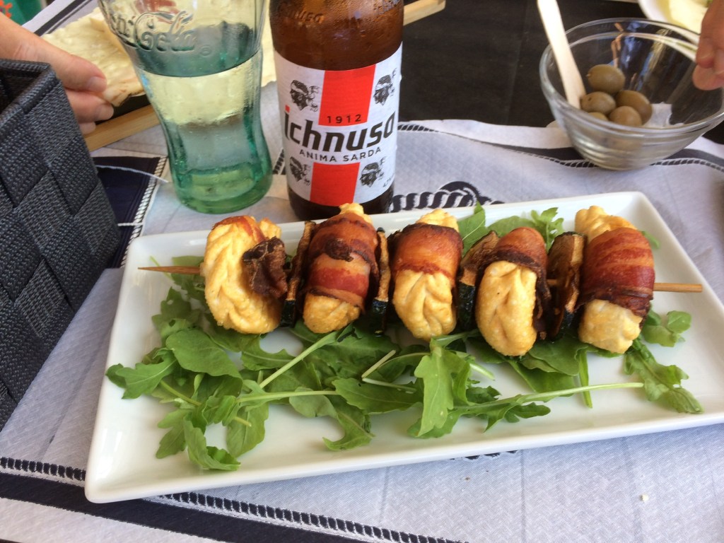 Beach bar food, local pasta filled with herbed potato, wrapped in bacon and bar b q – mmmmm & local beer