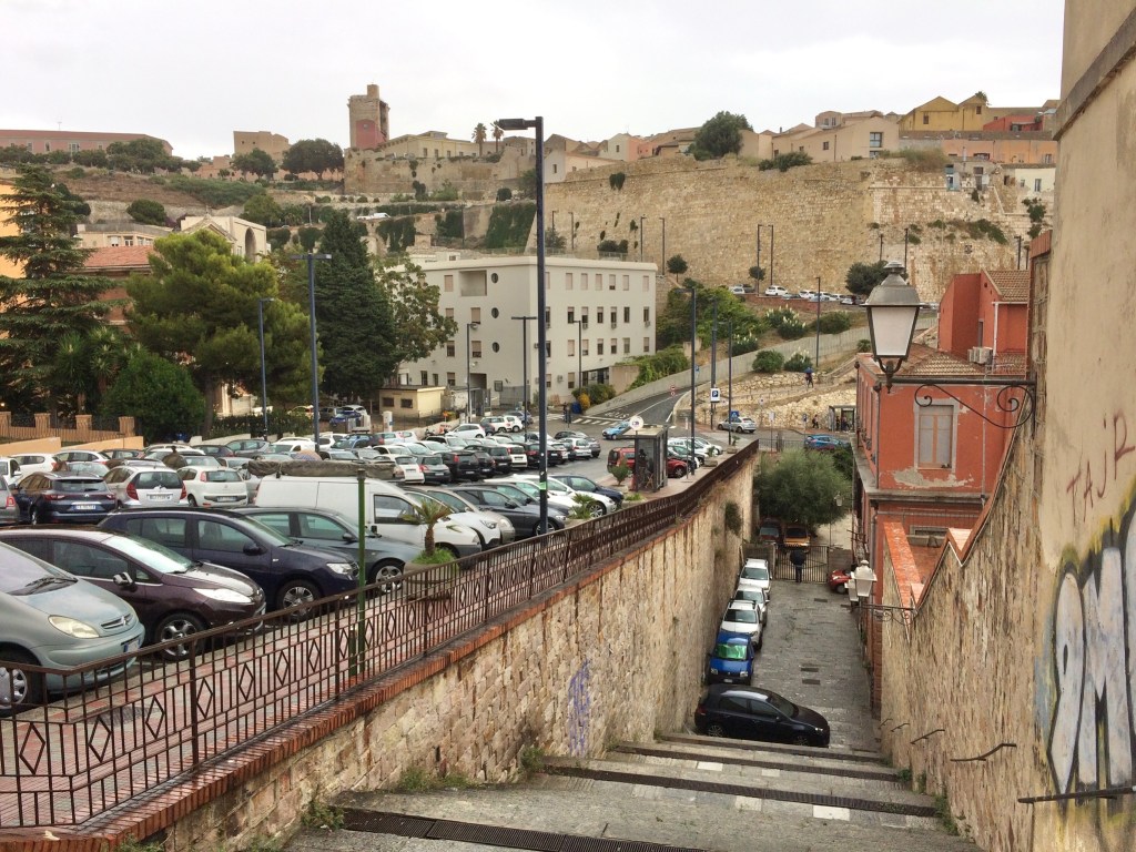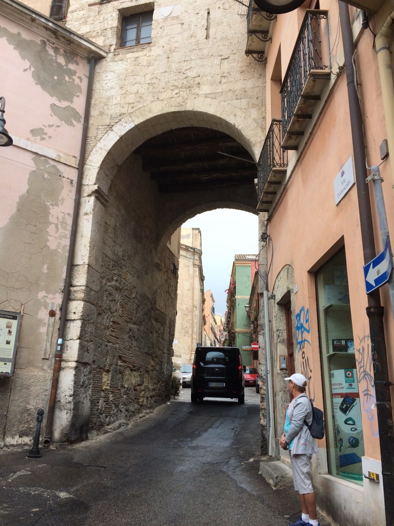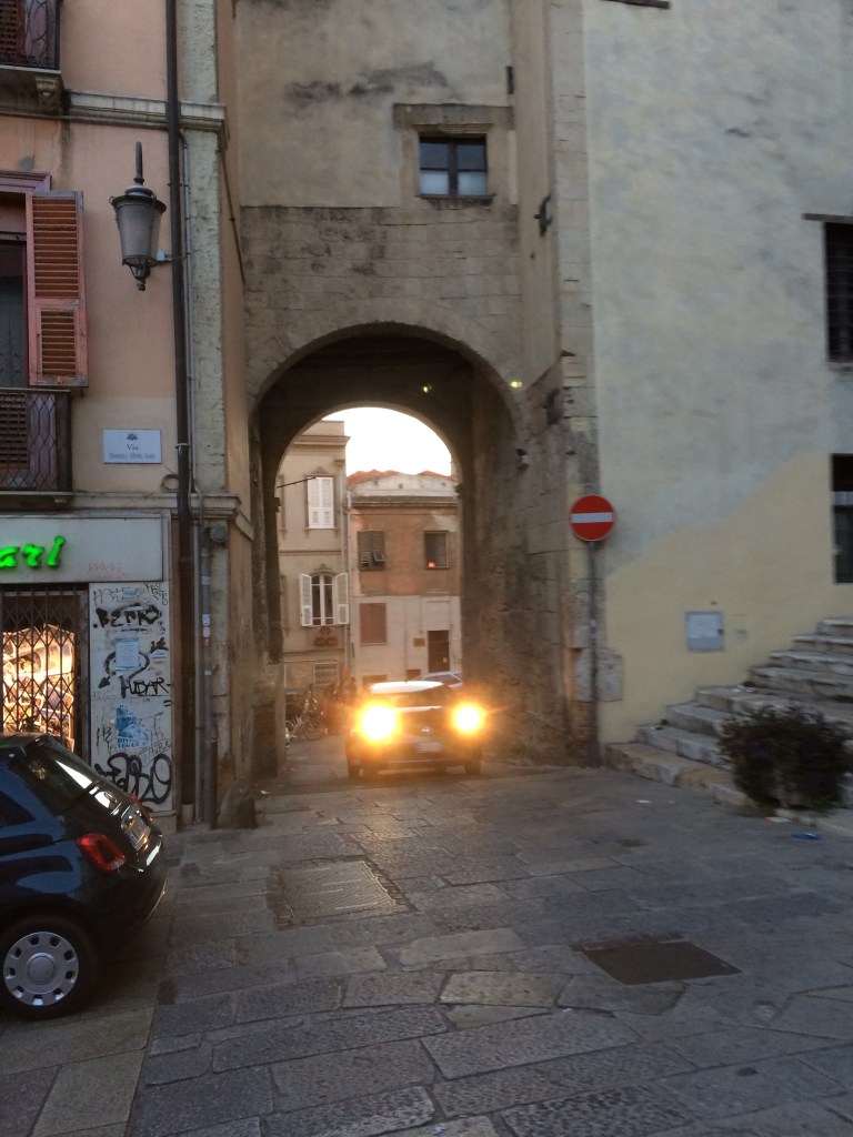 We drove to Cagliari across Sardinia from Olbia in the north-east, and followed Google Maps to our AirBNB destination, within the Old City Walls. In fact without Google Maps and folding rental car wing mirrors – see road access pic below – we would not have found our destination. But once there, we tucked the hire car into the gateway of our rather quirky “ love nest” accommodation and set off to seek supper and an initial explore of the medieval Castello.