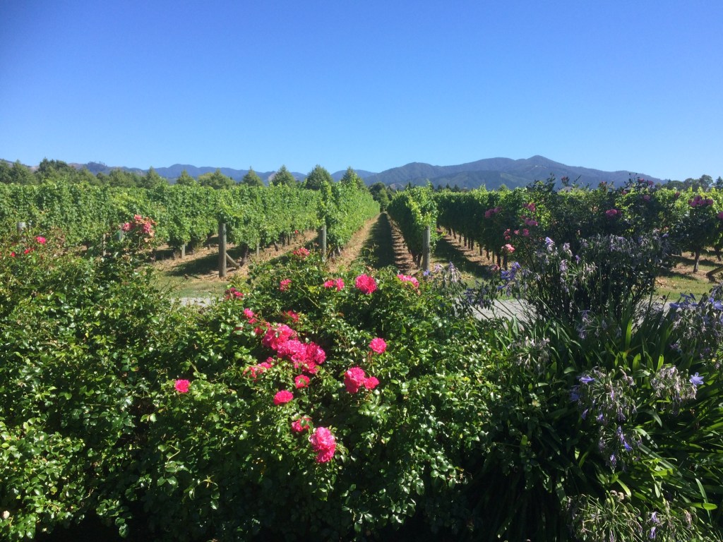 Rose garden overlooks Sauvignon Blanc vines near Blenheim