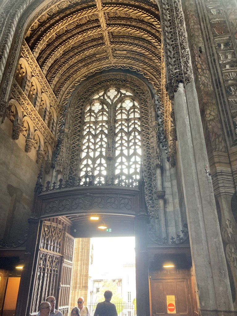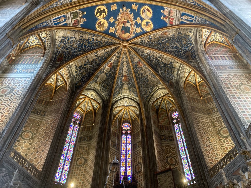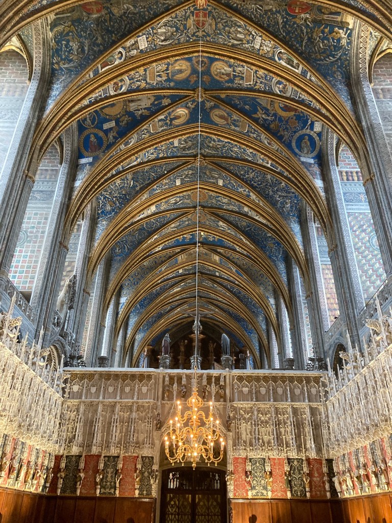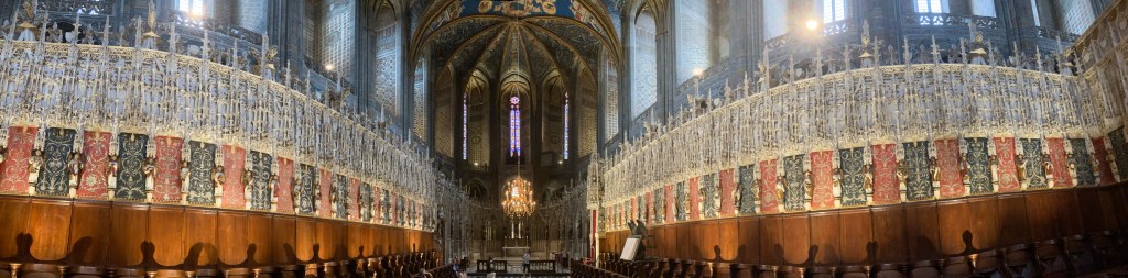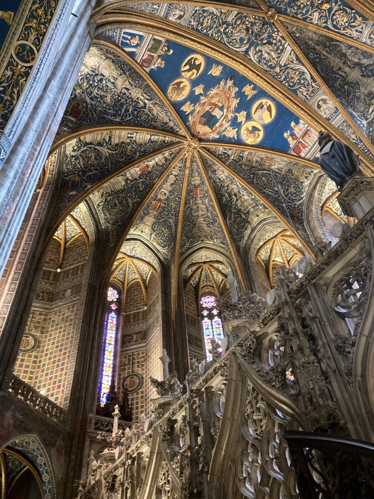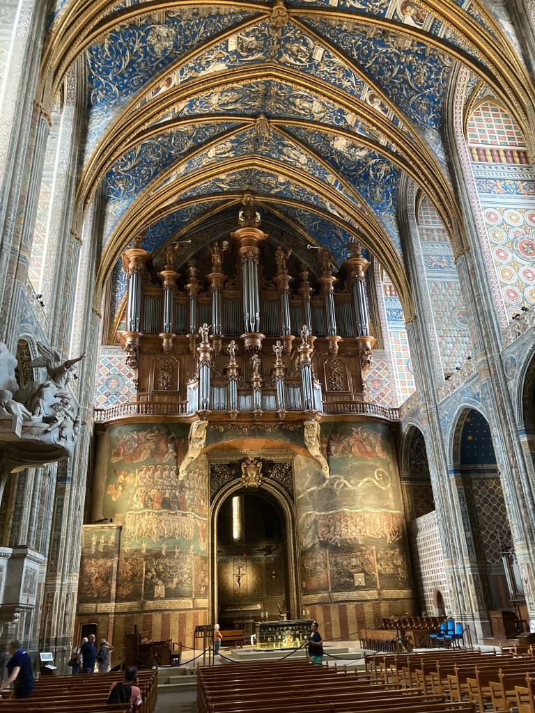 But for us the crowning glory of Albi must be the interior of Cathedrale St Cecile, largely painted some 500 years ago , not renewed since and today still in wonderful condition. Just using a modern IPhone we have attempted to capture the incredible workmanship of so many artisans over the centuries that have created and today maintain this Cathedral – :-