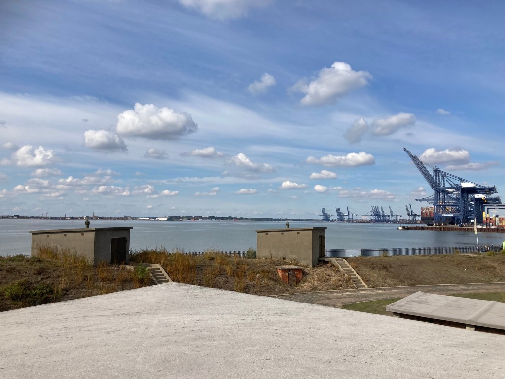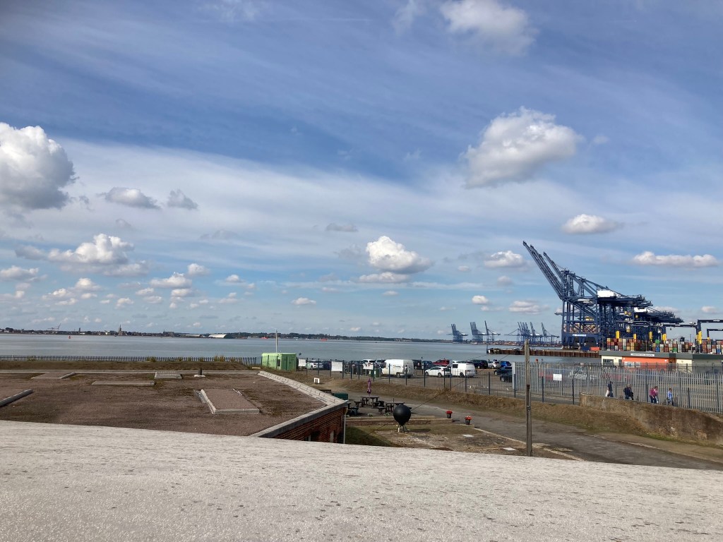Originally built by Henry V111 at a time when Roman Catholic Europe was very anti his “Defender of the Faith” policy, Landguard Fort sits on the north side of the Orwell Estuary, across from Harwich and adjacent to the Felixstowe Container Port. With danger from Europe in Tudor times, forts at river mouths such as the Orwell and the Thames ( at Tilbury), were a most important front line defence against attack.