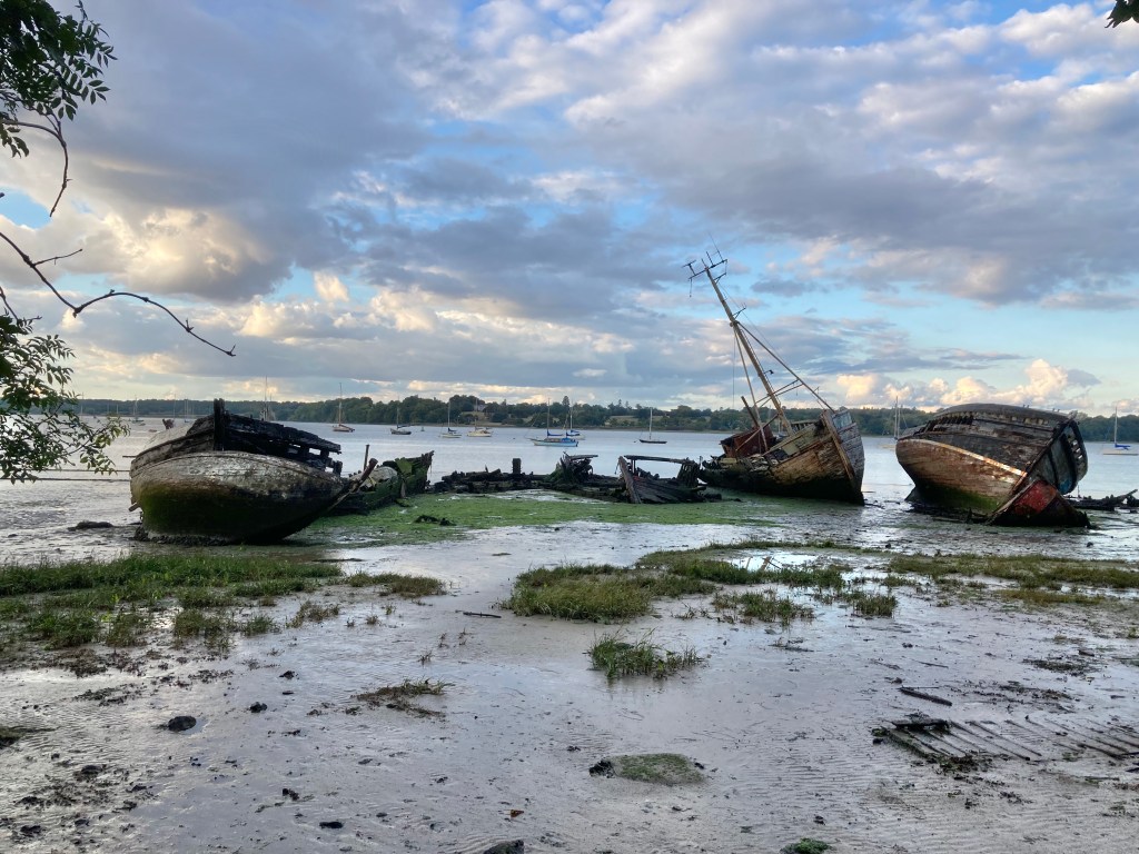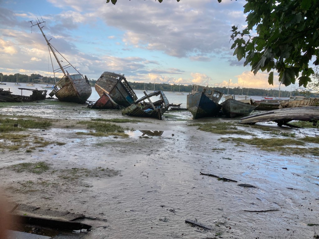 The Orwell drains out of rural Suffolk through Ipswich and down to the North Sea at Harwich/Felixstowe where it joins with the River Stour. Tidal flows are strong all along the east coast, used by sailors through the centuries to speed their journeys. Thames Barges like the XYLONITE in the pic below would carry cargoes like hay, bricks, gun powder and much more to London and across the North Sea. At high tide the River Orwell was lapping upside the wall of the pub as we arrived for lunch, but the river mud was soon revealed for our post lunch stroll, and with it the decaying bones of boats , left to the mercy of the elements.