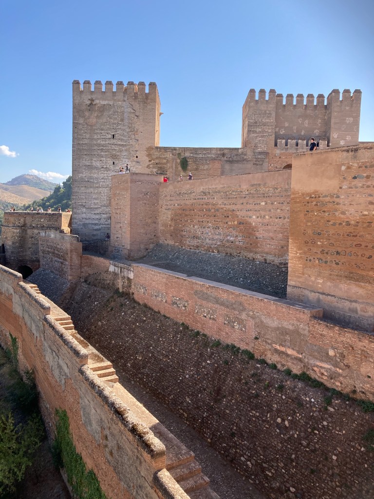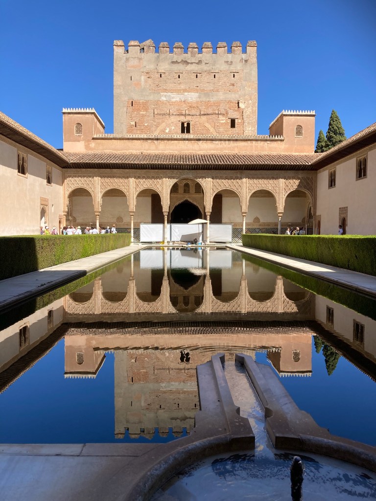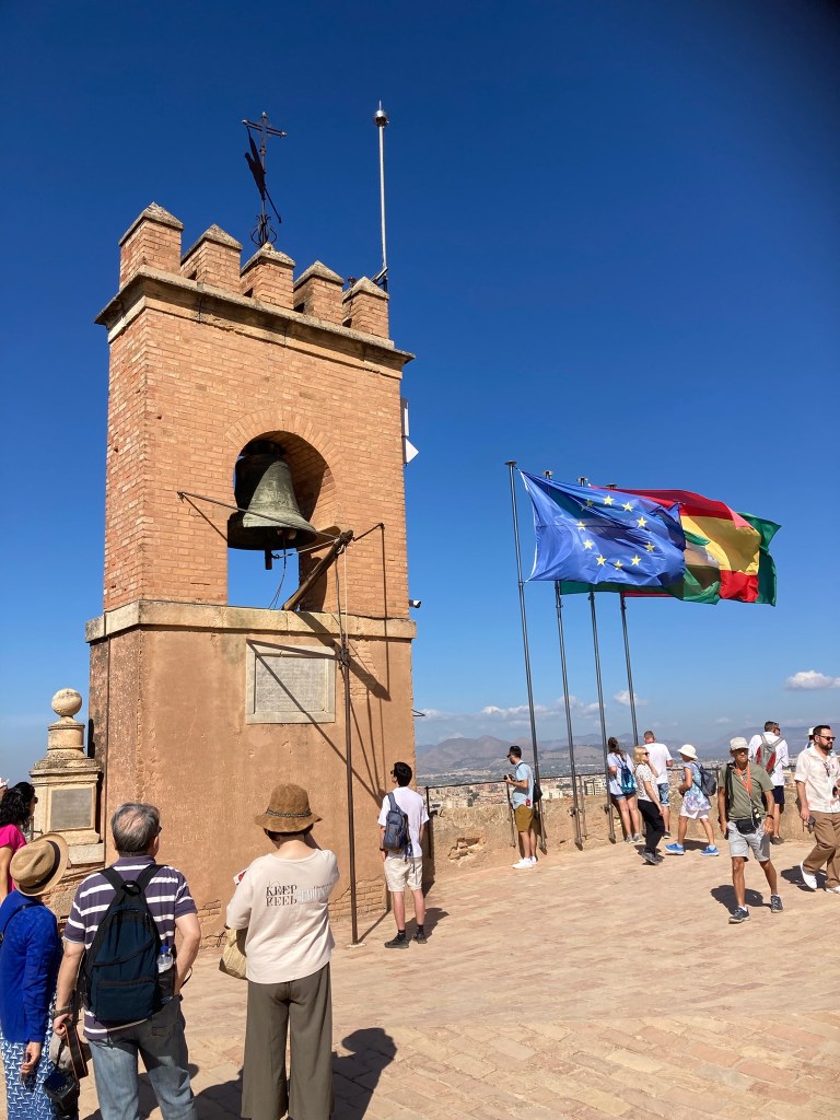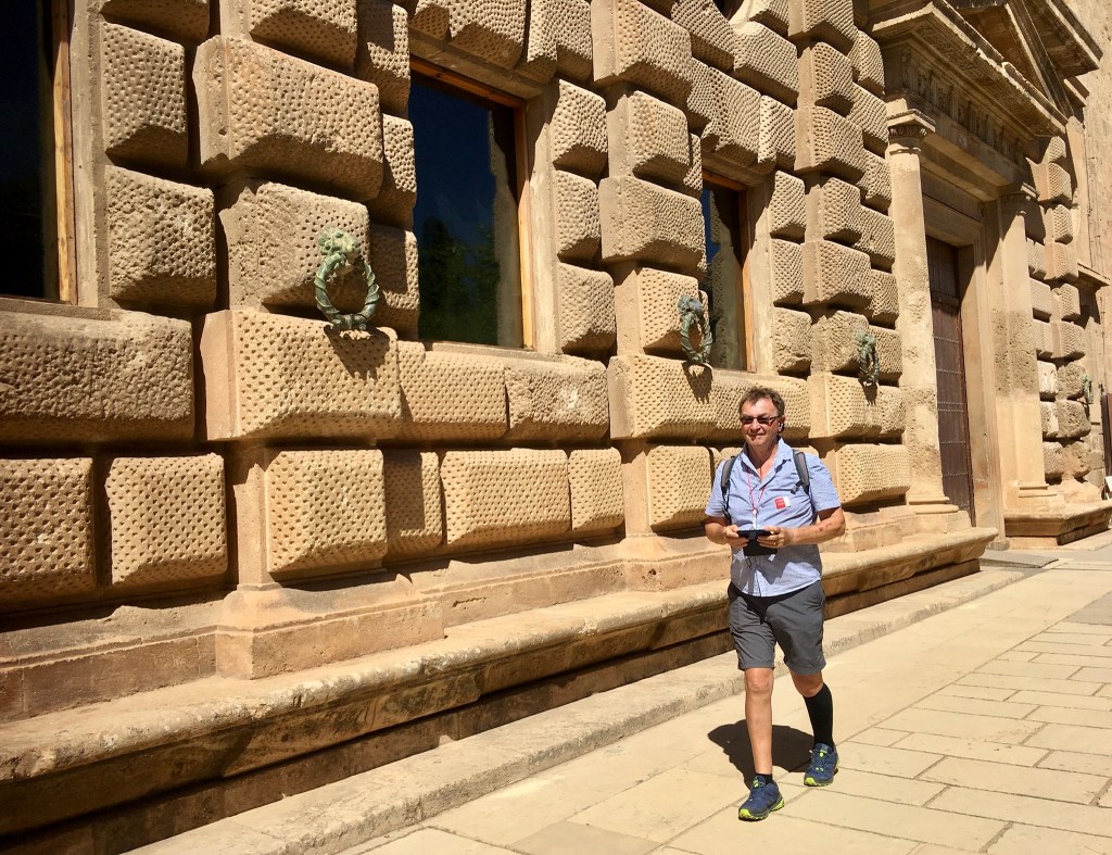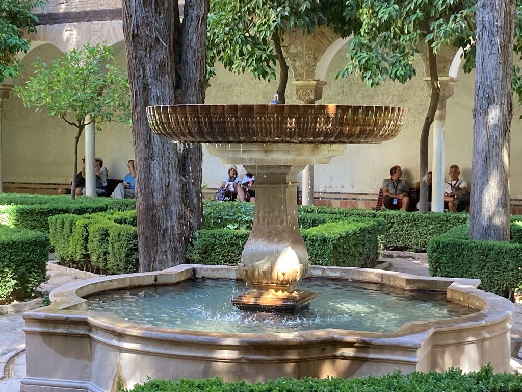 There are buses up from the centre of Granada to the Alhambra but we elected to walk from our apartment, down to the city centre and up the hillside with beautiful quiet gardens, to our tour meeting point. The tour was in two halves, the Gardens first and then the main palace and fortification itself, with a pause for toilet stop, ice creams, coffee at halftime – excellent clean loos!!