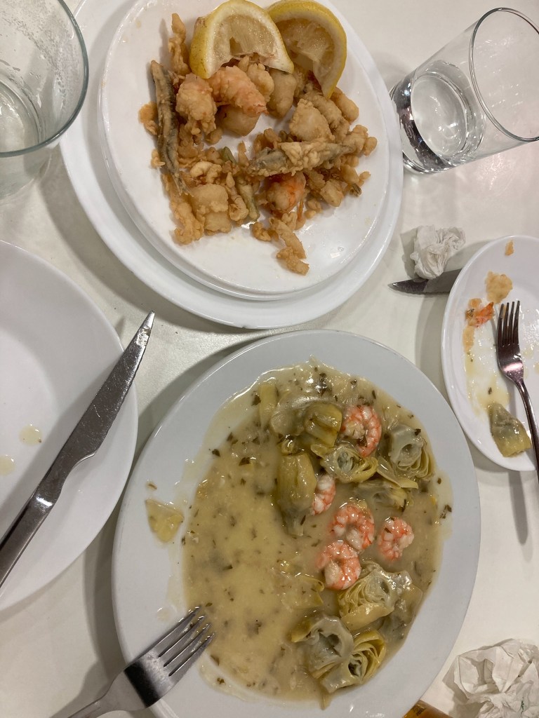 Our apartment reception had suggested this Tapas Bar as being one mainly offering seafood and predominately for locals. We were told, if there is room – place very popular – you grab seats at one of the tables, sharing therefore with 2 or 4 other customers. With the first drink order, some tapas is also automatically delivered and following that, you ordered off the menu as much other food as you could manage. Enjoying our first drink and a starter of Squid, we watched food being delivered to other tables, worked out what looked really good and told our waitress – “Ola can we have one of those”?? YES!!! The fried mixed fish and then the prawns, seafood artichoke casserole – excellent , very filling and lots of fun!!