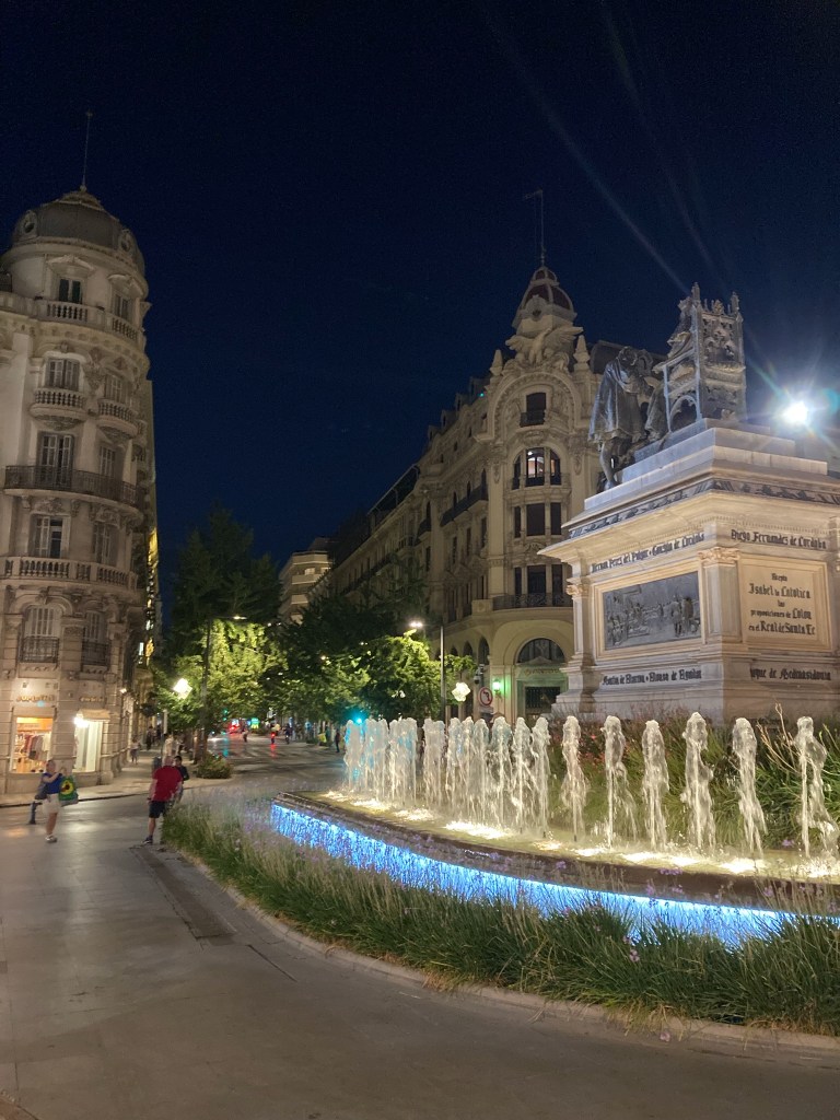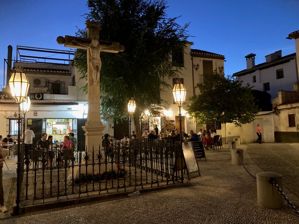 After a big day of being tourists in Granada, a quiet evening meal was needed, and we circled back above the Cathedral into the Albaicin district and found a quiet square, church in the corner and three small restaurants to chose from. We settled in to enjoy some supper and to reflect on our time in Granada. As darkness fell and the lights came on, Granada put on a new show – different from daytime but just as impressive:-