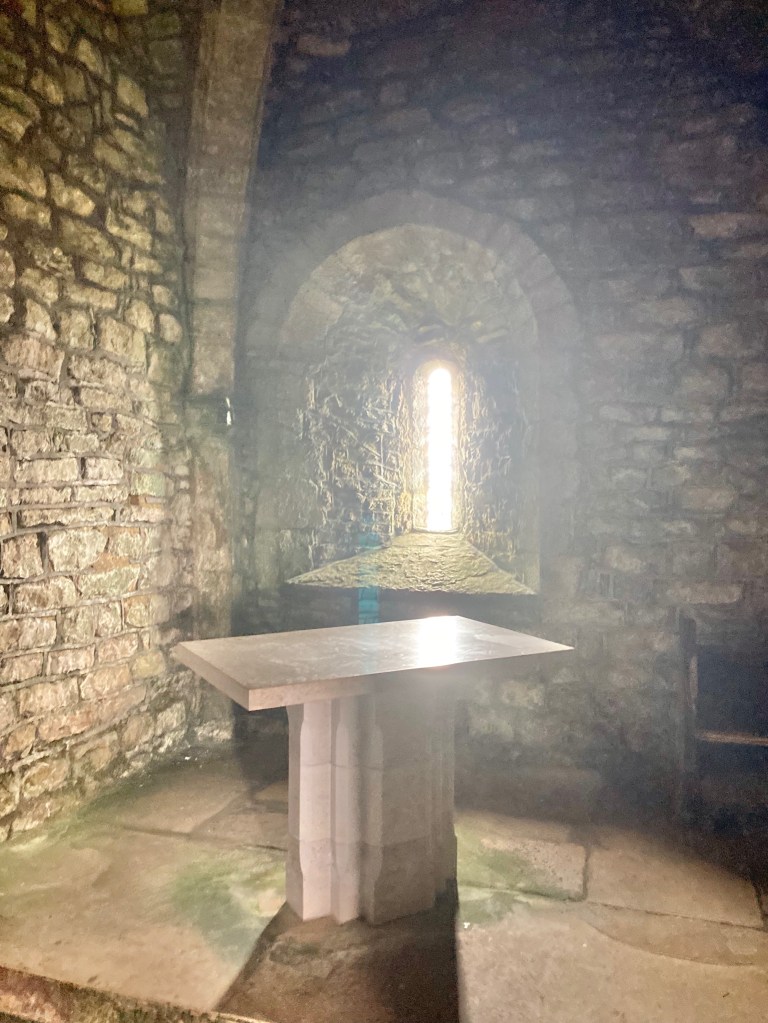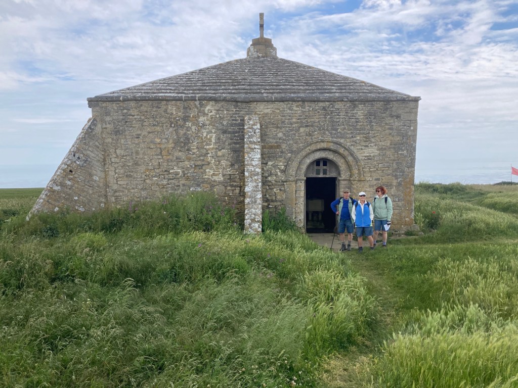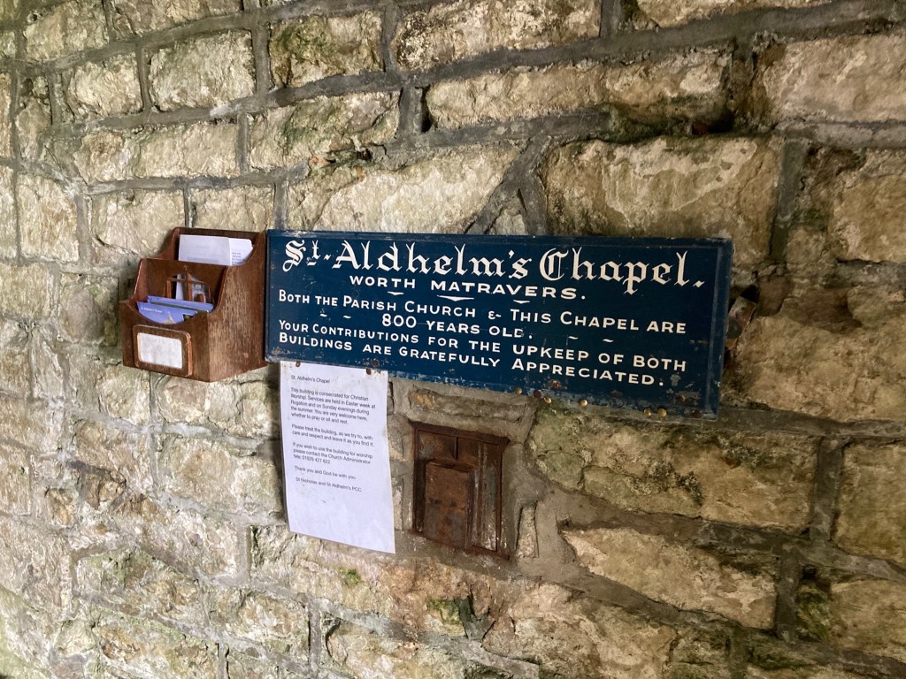 We get a peek into the unusual St Aldhelms Chapel or more correctly Chantry- where a priest would celebrate mass for the safety of sailors , dating it seems from the 13th century. Its amazing to find a place of worship in such a remote location. Its square, 7.7sqm in area with one tiny “arrow window”, by the altar, with each corner matching the points of the compass. Built of local stone walls with slab stone roof, so typical even today of buildings in this area.