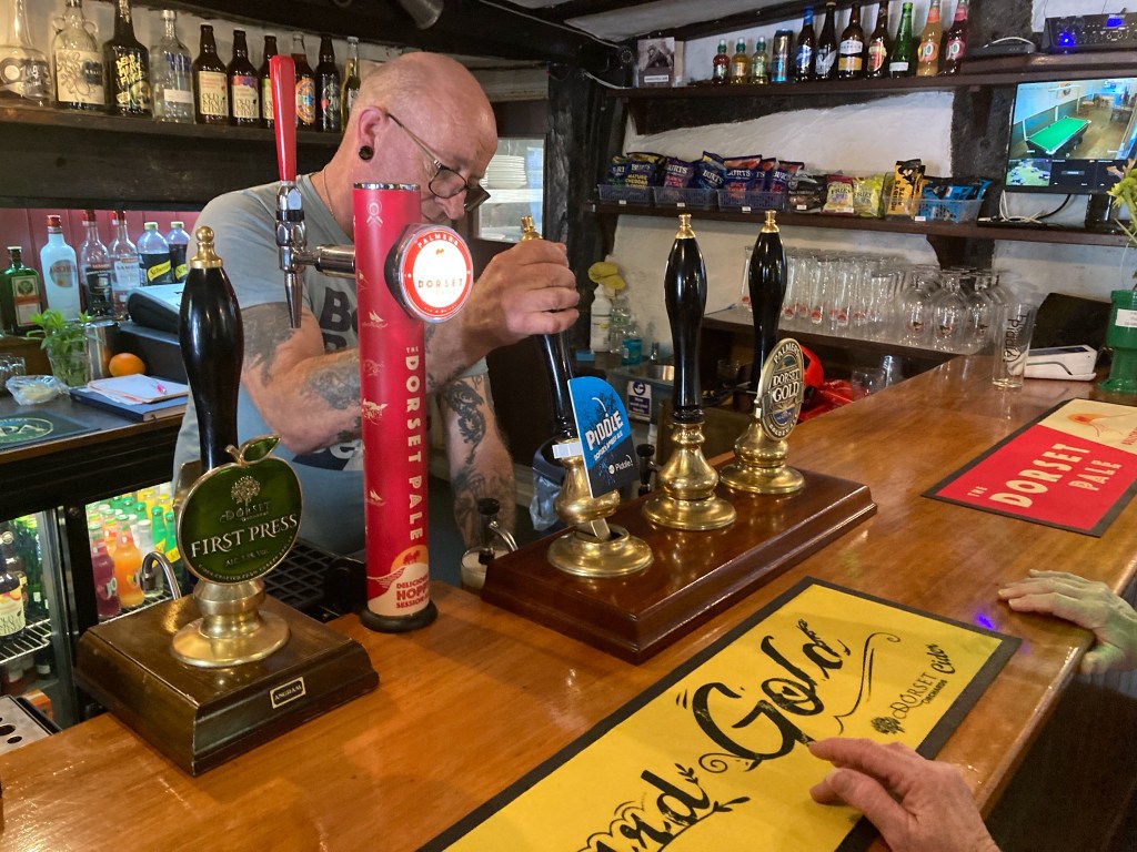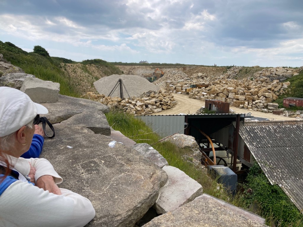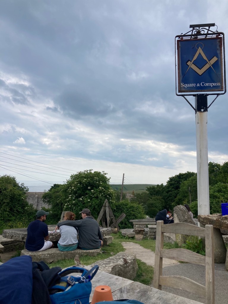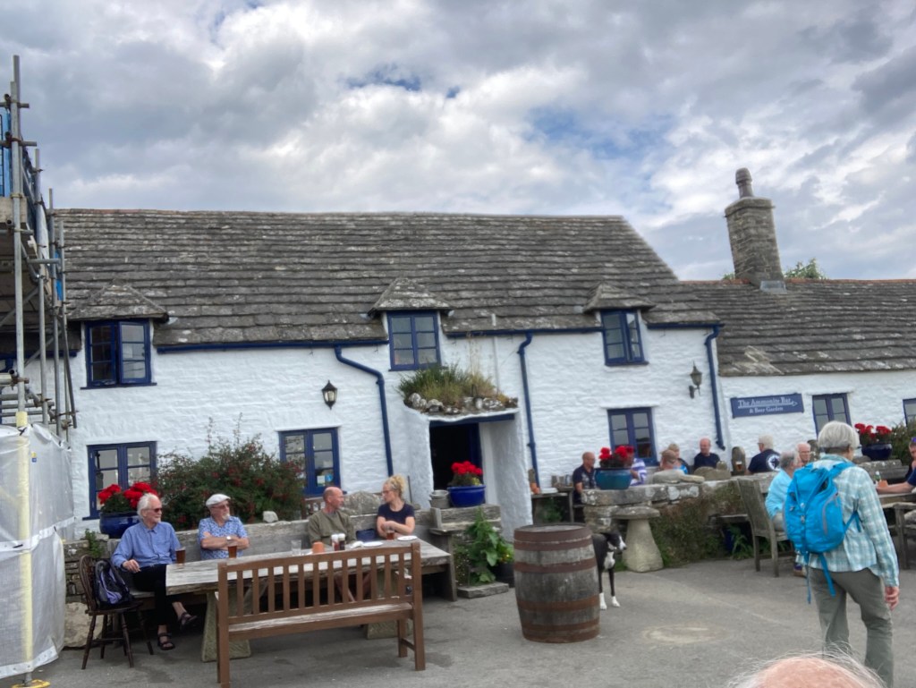 We then walk back to the Worth Matravers village, past working quarries extracting beautiful big blocks of limestone plus crushed stones from the “failed lumps’ and onwards past houses built from the local Purbeck Limestone – to end up at the Square & Compass Pub. A beautiful old building with a small Museum. Inside the rooms are wood panelled, very low ceilings and lower door frames as i found out!! But Ginger beer and local ale, gravity fed, are then much enjoyed with views over fields to the English Channel.