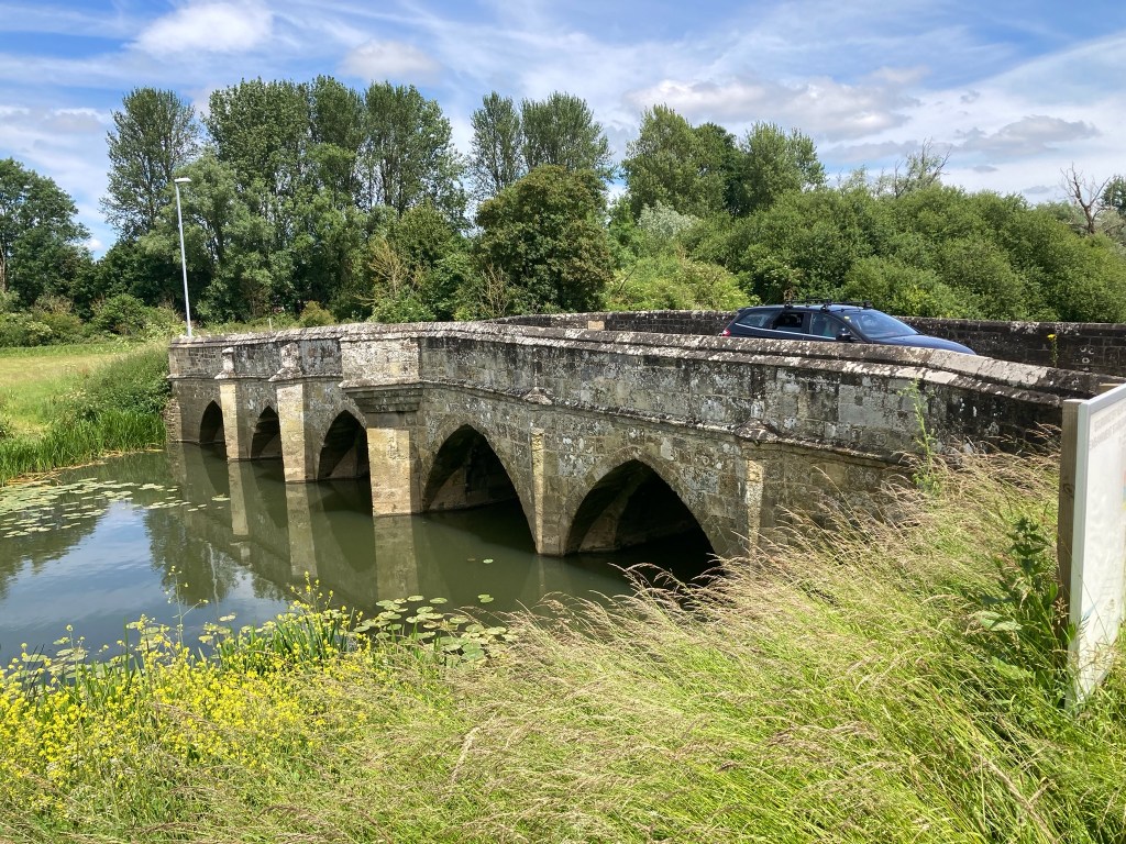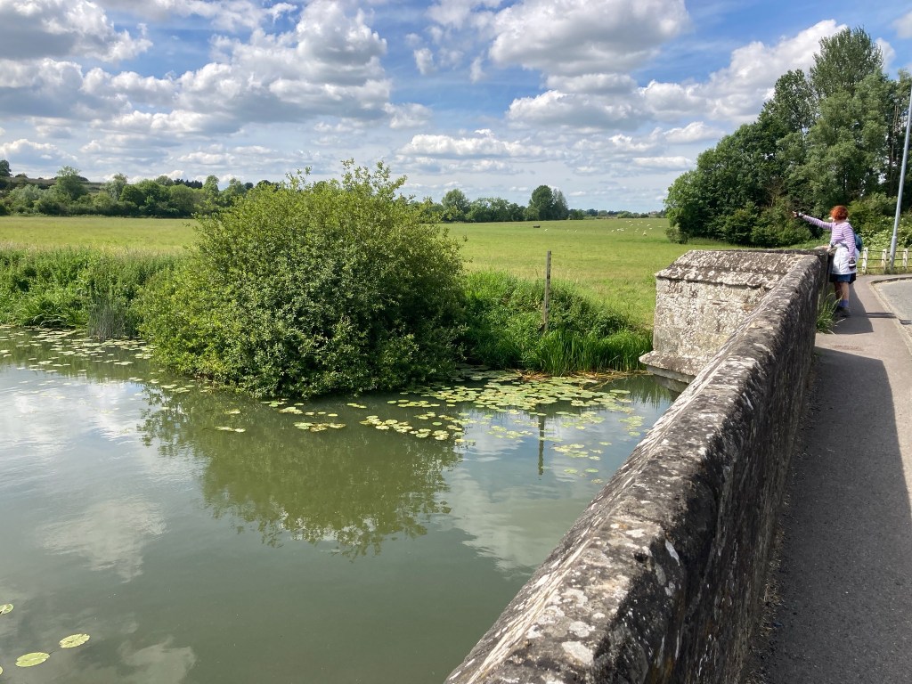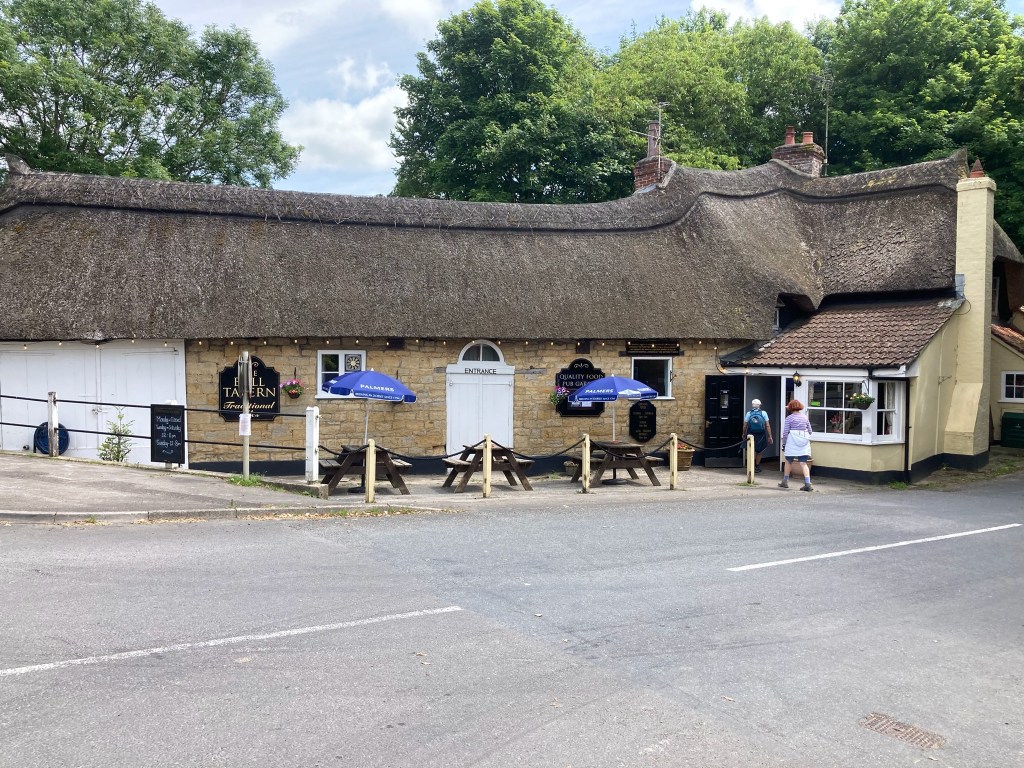 And then we get our Wednesday lunchtime, post ramble, pub – The Bull – “a pint of Piddle” please- and what a super building – yet more v low doorways, some intriguing thatch work with plaster cladding. A table and seats out in the garden to enjoy the warm sunshine with tractors rumbling past, trailer loads of grass going one way and manure the other way – the longest day ( June 20th) is imminent and farming is in high gear.