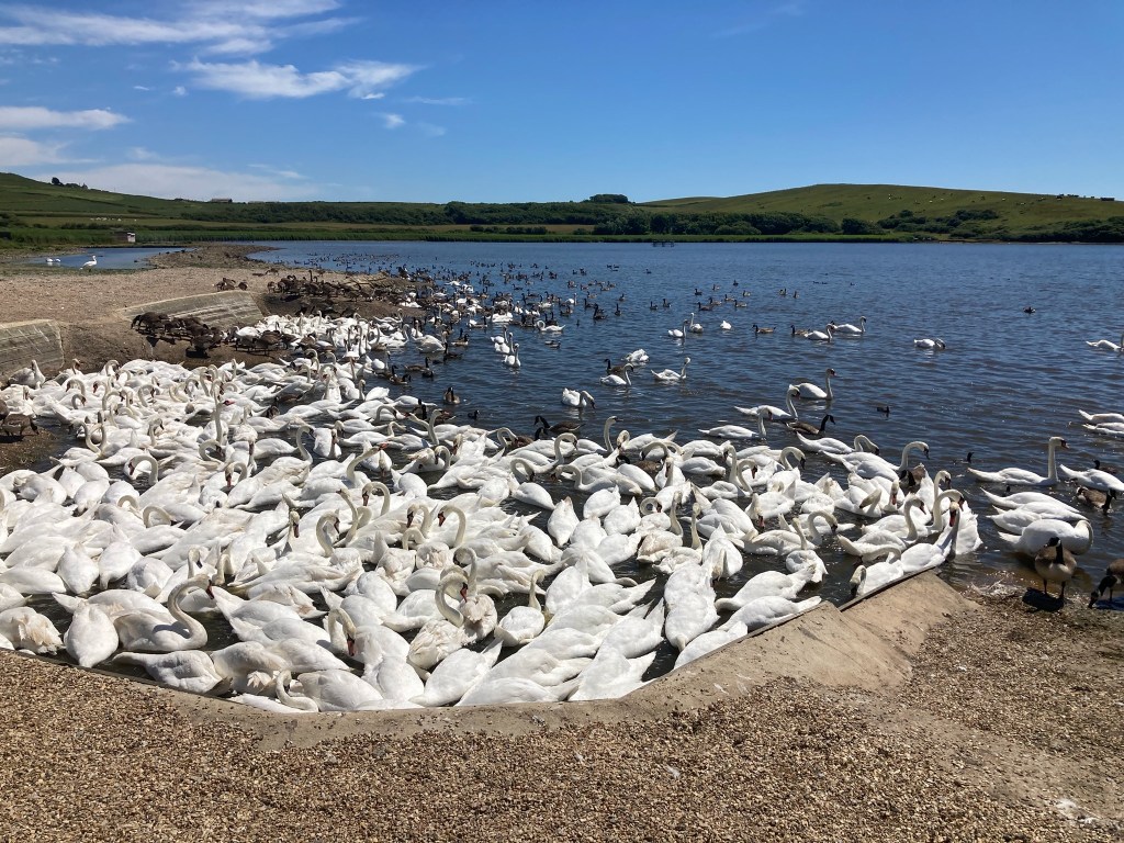 Thursday brings more sunshine, warmer again and we are off to the coast to the ancient Swannery at Abbotsbury, its nearby sister Tropical Garden with views down and along Chesil Beach towards Portland Bill. The Abbotsbury Swannery, created by monks for a source of protein and feathers for quill pens, is about 800 years old. It sits behind Chesil Beach and uses the northerly end of the “Fleet” a lagoon with an unique mix of fresh water issuing from the limestone springs and sea water at the southerly end. The Fleet was used by Barnes Wallis in WW2 to experiment with “bouncing munitions”. Today its home to thousands of Mute Swans, Canada Geese and other wild fowl, who are fed and looked after by the team at the Swannery.