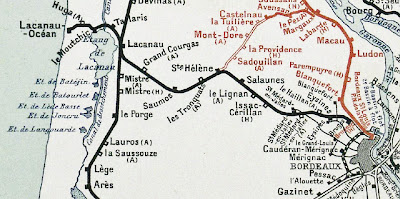 Had we arrived in 1924, we would have taken the Train from Bordeaux’s Gare de Medoc to Lacanau and even on to Lacanau Ocean at the coast. The train line network (see pic below), built circa 1885, across the Medoc was originally to ferry maritime pinewood within the Bordeaux region. But this then developed with tourist passenger traffic and the 60km train ride would have taken us 3 hours from the Gare de Medoc to Lacanau. The line was extended to Lacanau Ocean in 1905.