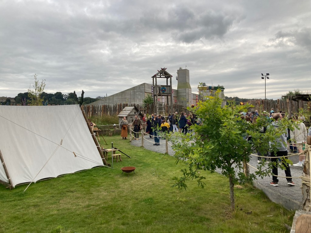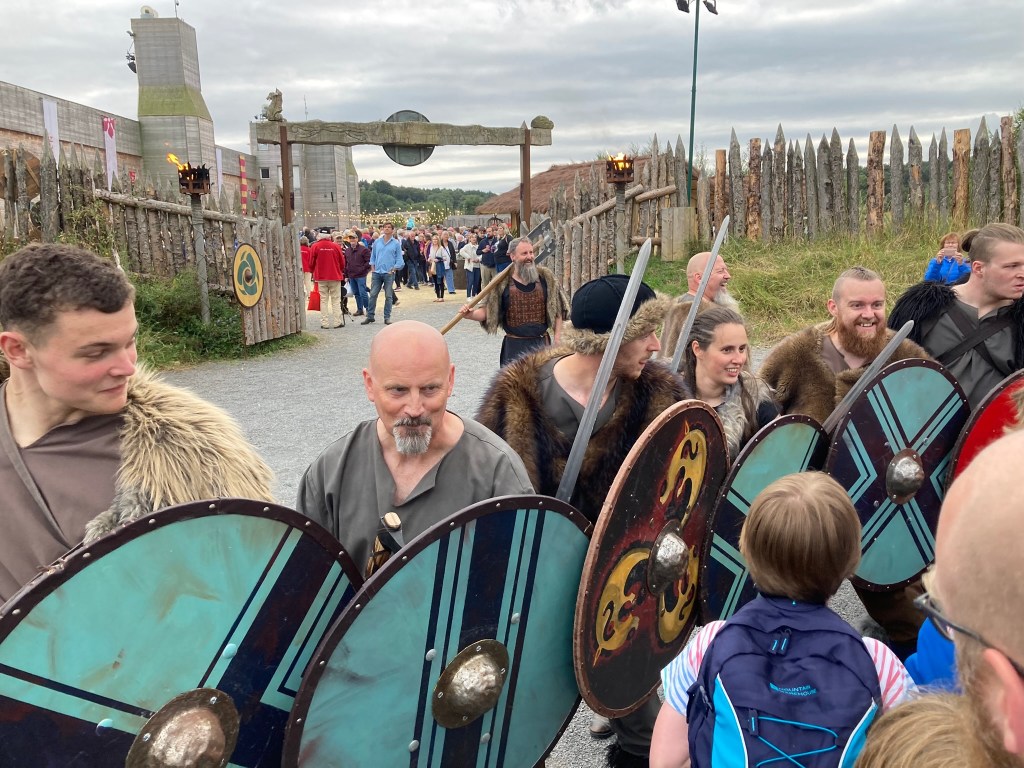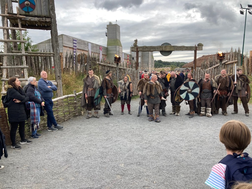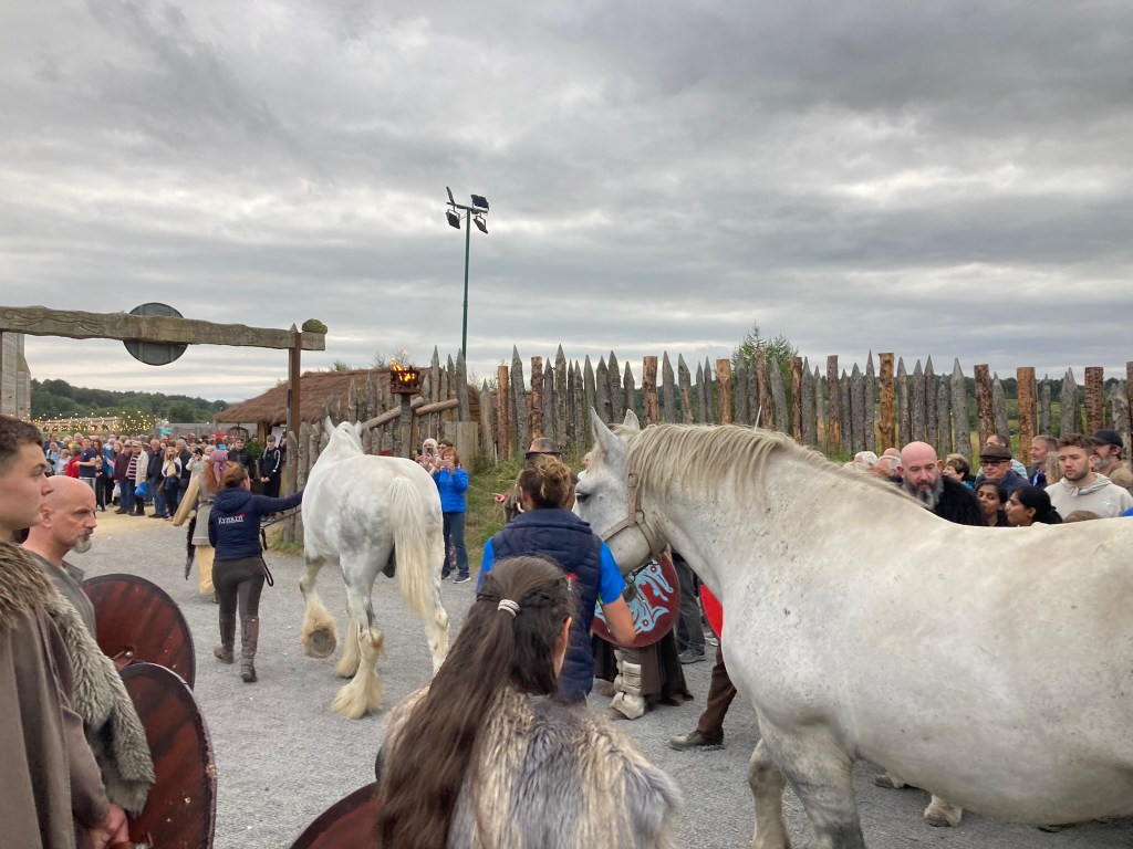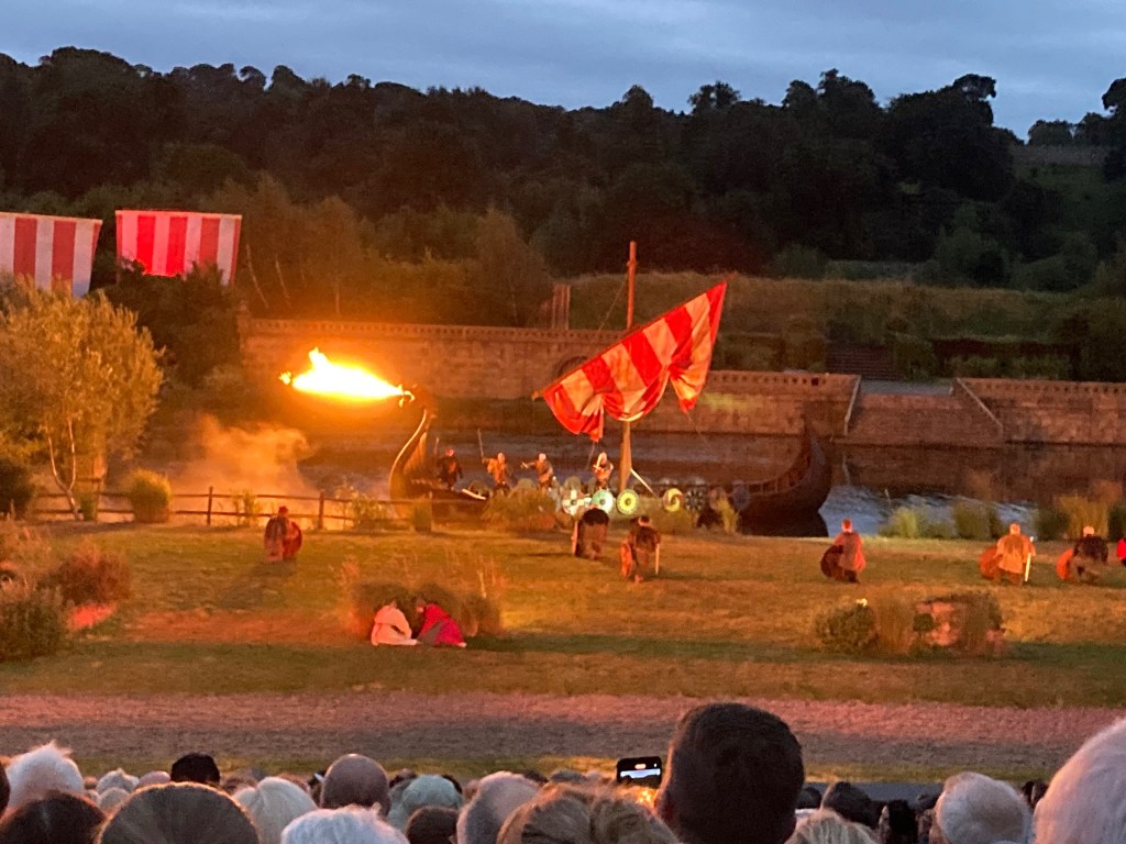 it would be remiss not to mention the “Vikings Village”, that attendees were encouraged to visit before the Kynren performance started. We had to queue to walk through and see the “re-enacted village”, but en route there were a long series of excellent storyboards on English History, and the evening ahead!! It was definitely a family event, children perhaps 8 upwards , but there is so much brilliant action that takes place from all sides – jousting knights tilting at targets riding full pelt along the roadway in front of the audience – geese & sheep being driven across the “stage”, plus all that was performed on the lake and behind it – and the fireworks!! Absolutely an entertaining show for all family generations.