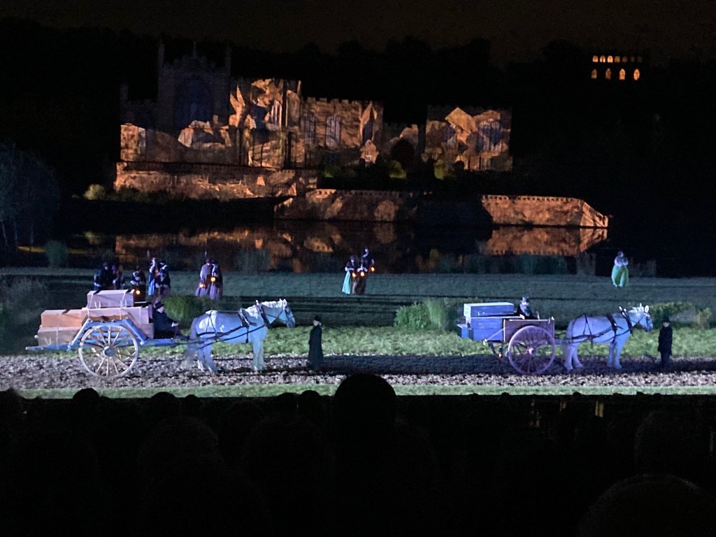 Along with 8000 others in the audience, the scene that greeted us from our seats in the open stand, was the view in the picture above. Just outside Bishop Auckland in the county of Durham in an open and seemingly innocuous area of valley is where Kynren is performed . So in front of us – we see just a straight piece of track in front of the stand maybe 300 metres in length, an area of grass and a lake!! No hint of what was about to unfold as the evening darkened!