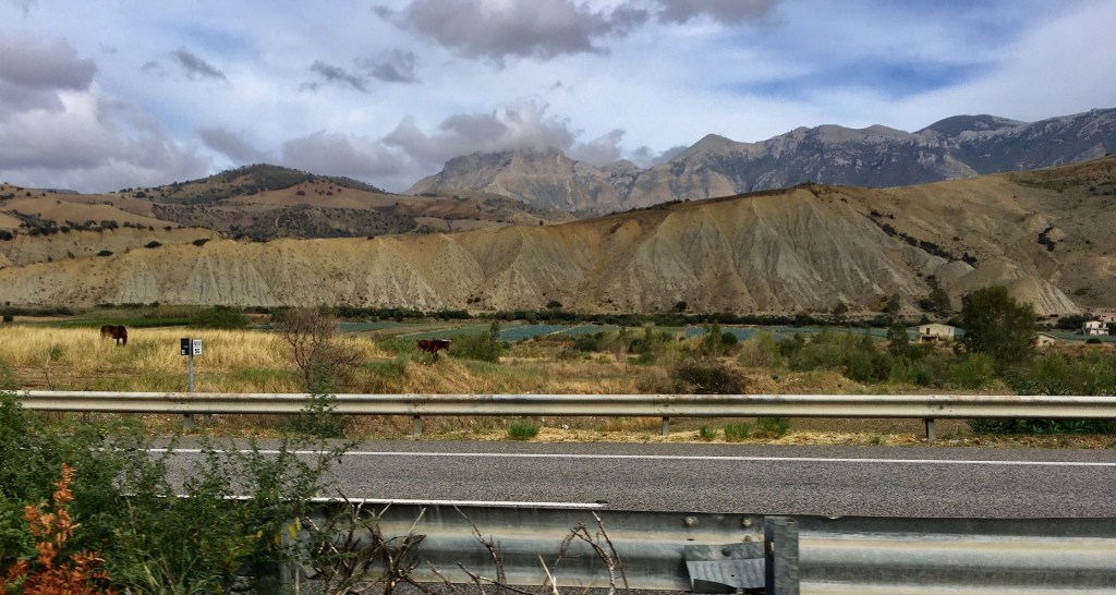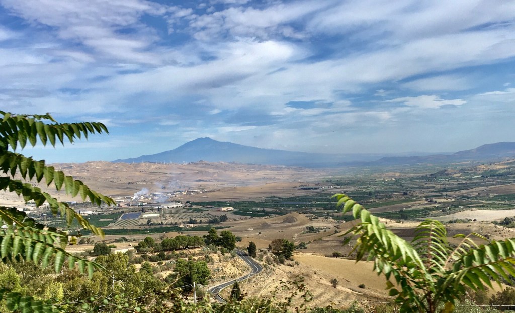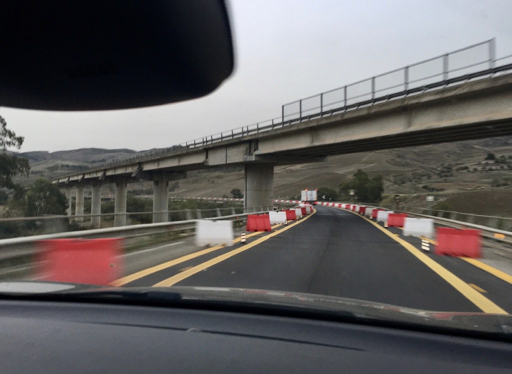 Anyway, we saw a bit of Palermo, the countryside from Cefalu there and back and the coastline between is lovely. But our time in N Sicily was coming to an end. With a plane to catch from Catania and a 2.5 hour drive to get there, we set off before dawn for the 170km autostrada trip, winding up the gorges and valleys past the Parco Del Madonie mainly on amazingly elevated roadways and lengthy cross valley bridging – vast amounts of concrete!! A few windy tunnels followed , some dual carriageway but others just one lane each way, unlit, quite narrow and challenging when the truck one was following has no rear lights at all!!