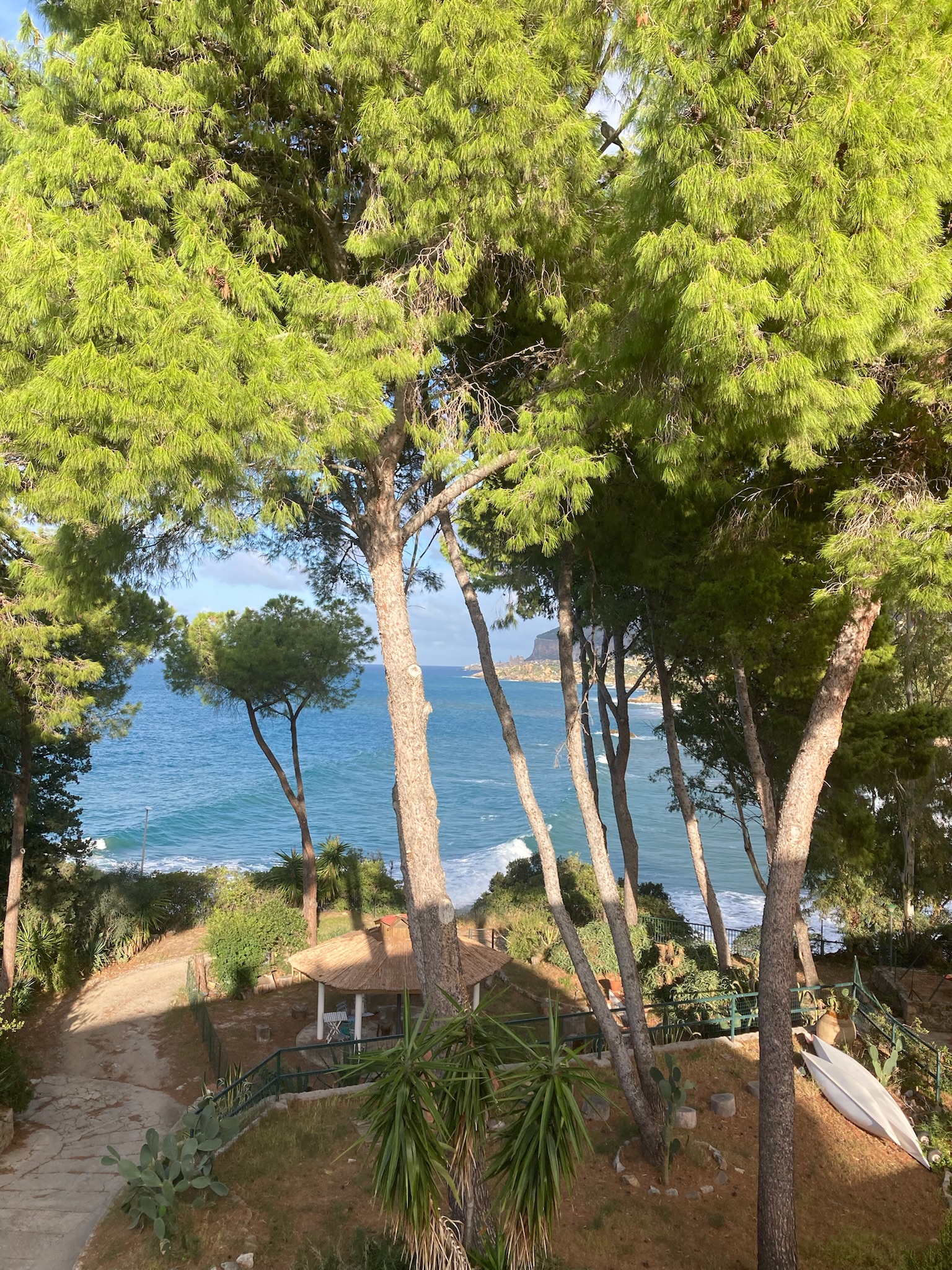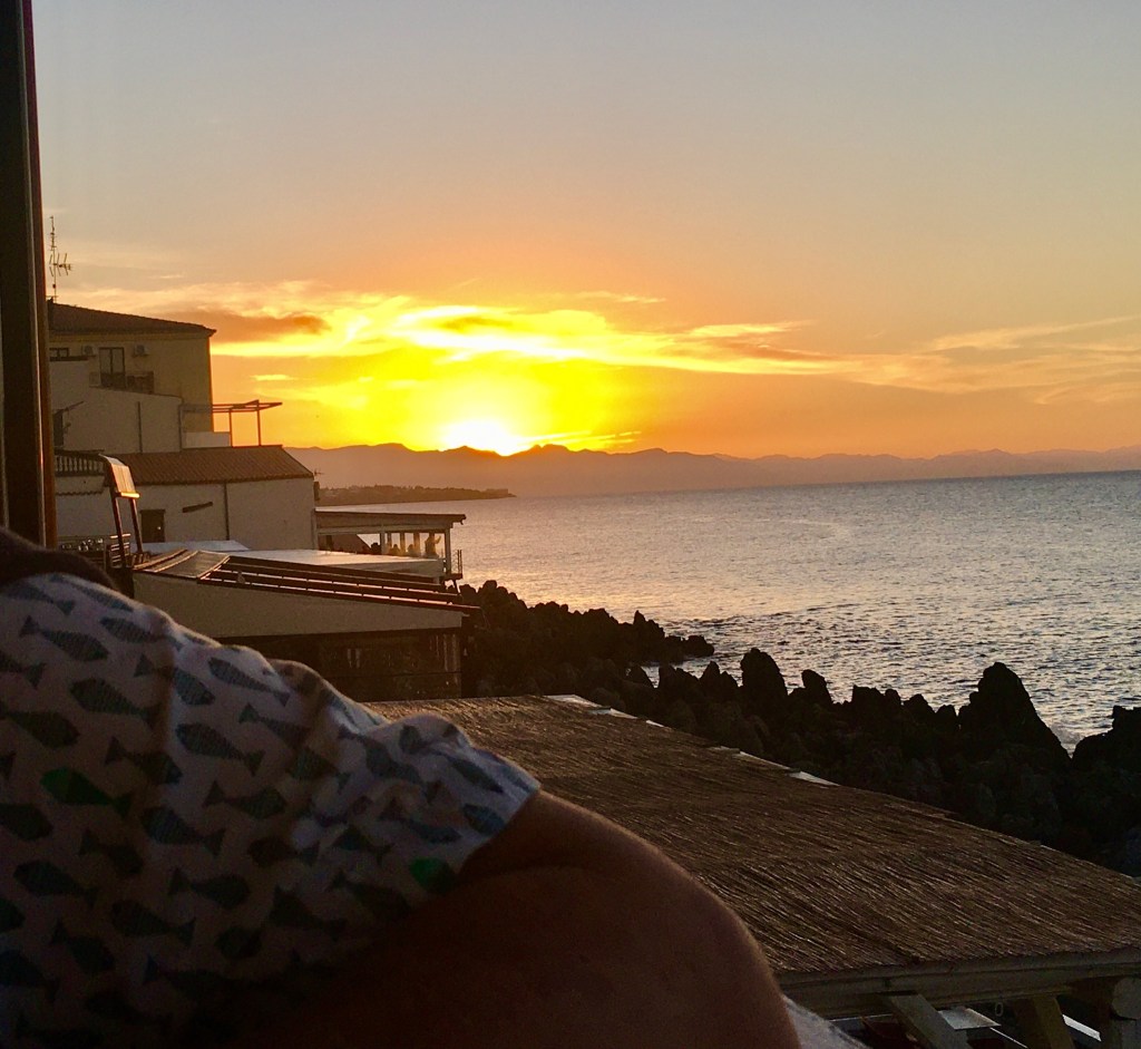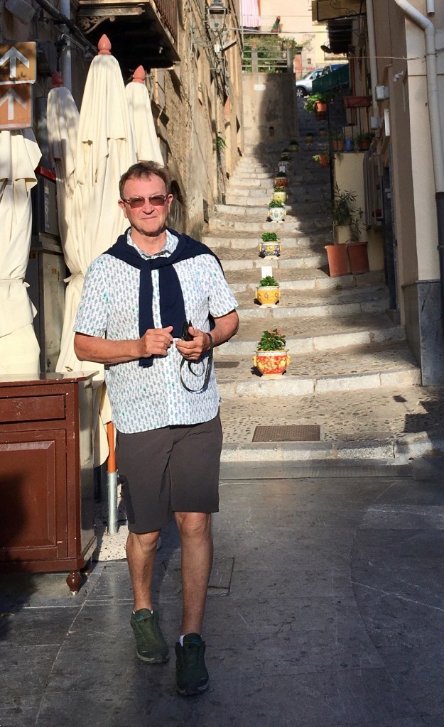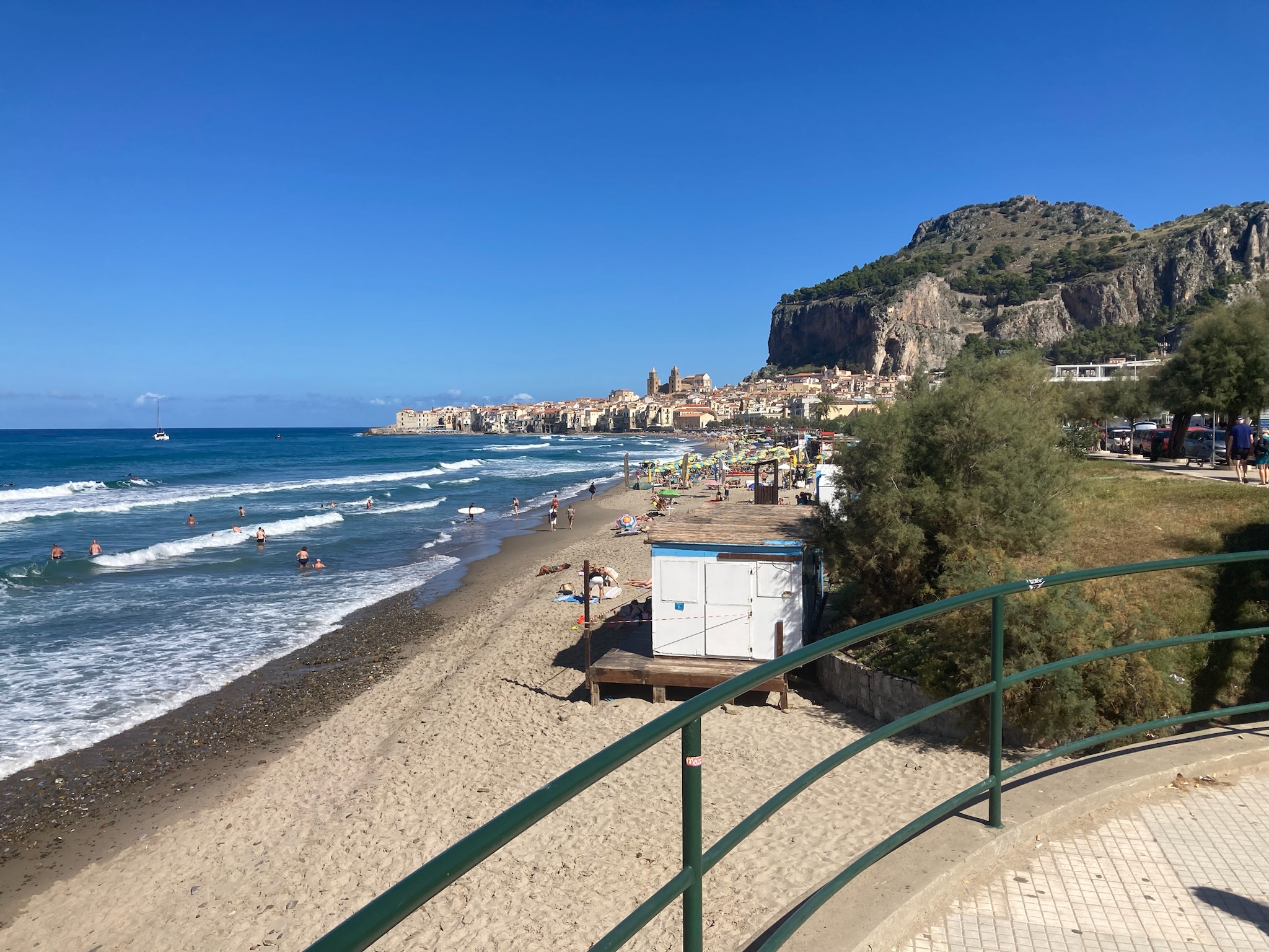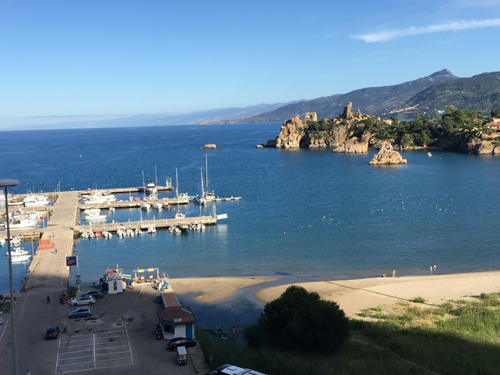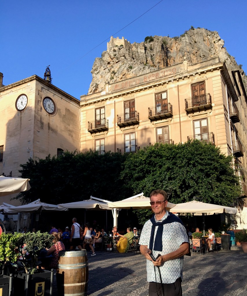 Our first view of Cefalu came from the balcony of our apartment that looked down on the “mistral driven surf” and the beach below, with the Duomo (Cathedral) of Cefalu in the distance, a lovely view to greet us looking through the pine trees. Whilst we could not swim due to the surf on our arrival day, the next day was much calmer and we did get in for a number of lovely warm sea swims from the very clean but slightly rocky beach. Intriguingly many Italian tourists seemed to most enjoy standing in the sea in groups and chatting, rather than taking any exercise – and why not!