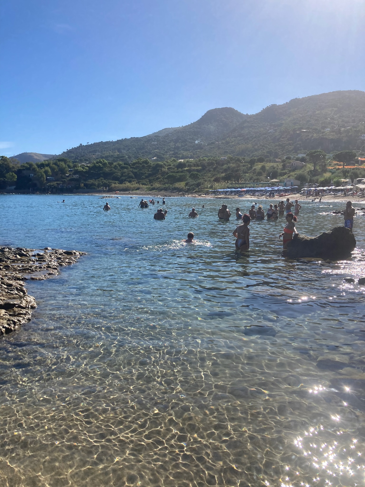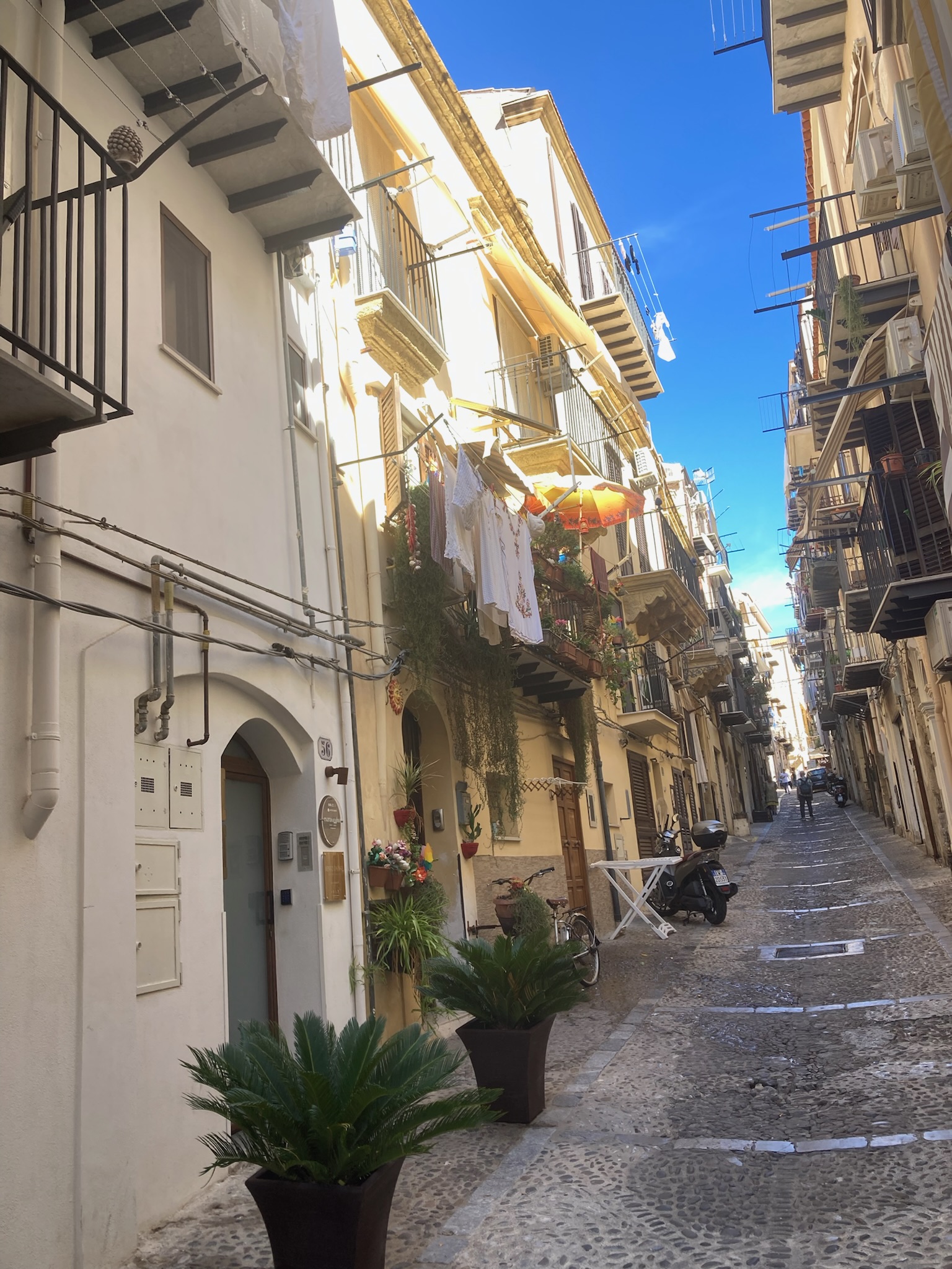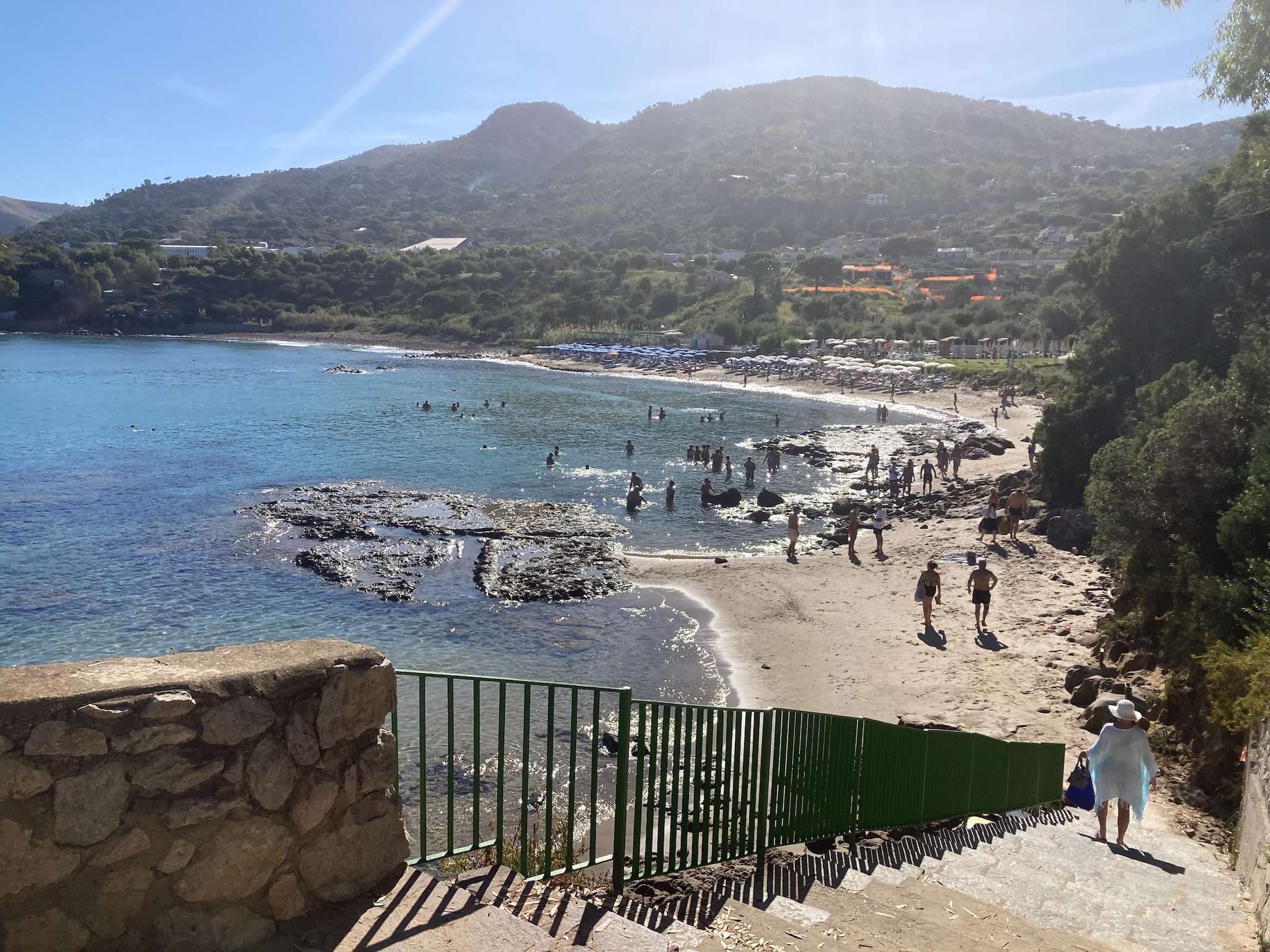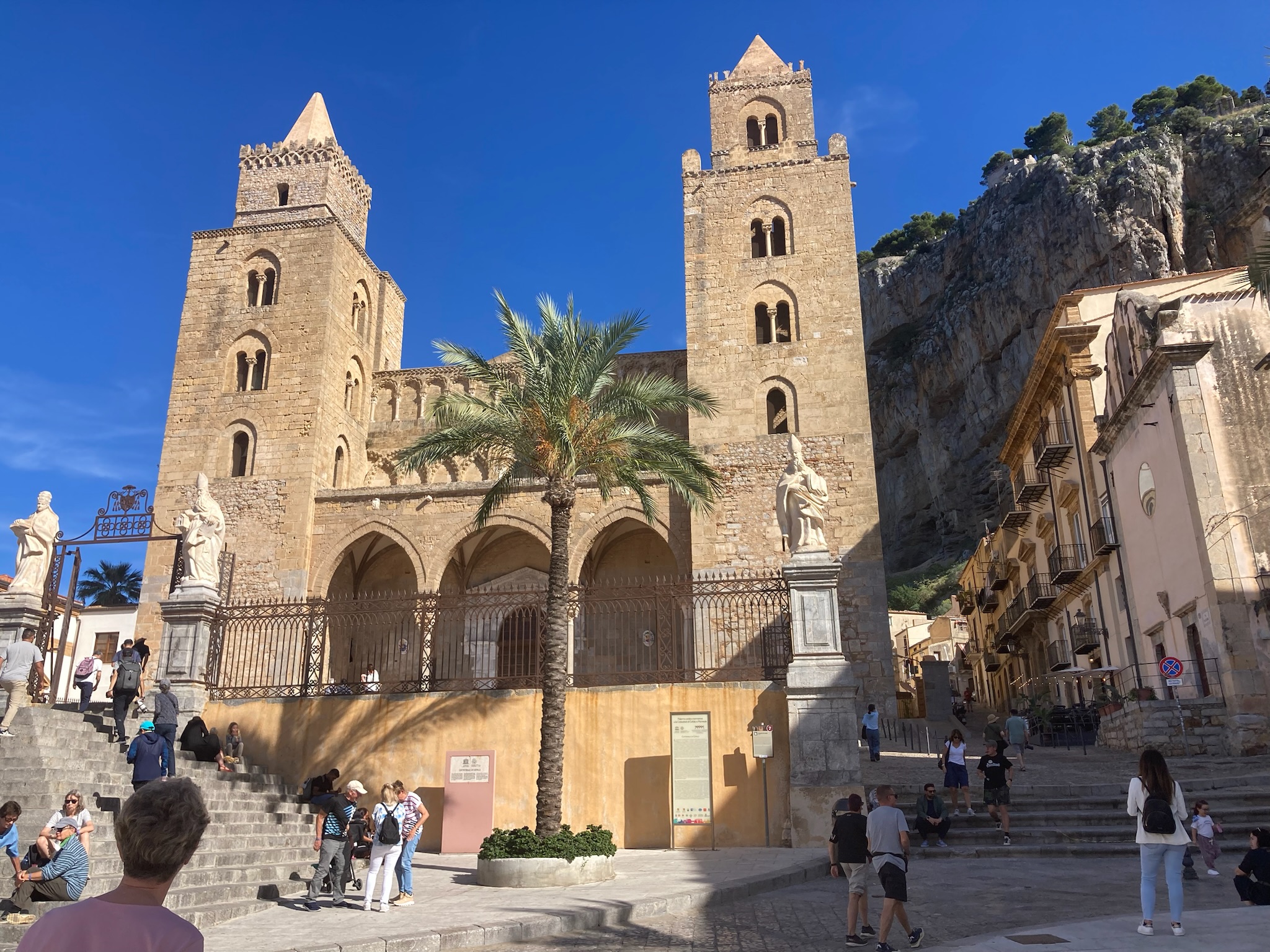 Our first view of Cefalu came from the balcony of our apartment that looked down on the “mistral driven surf” and the beach below, with the Duomo (Cathedral) of Cefalu in the distance, a lovely view to greet us looking through the pine trees. Whilst we could not swim due to the surf on our arrival day, the next day was much calmer and we did get in for a number of lovely warm sea swims from the very clean but slightly rocky beach. Intriguingly many Italian tourists seemed to most enjoy standing in the sea in groups and chatting, rather than taking any exercise – and why not!