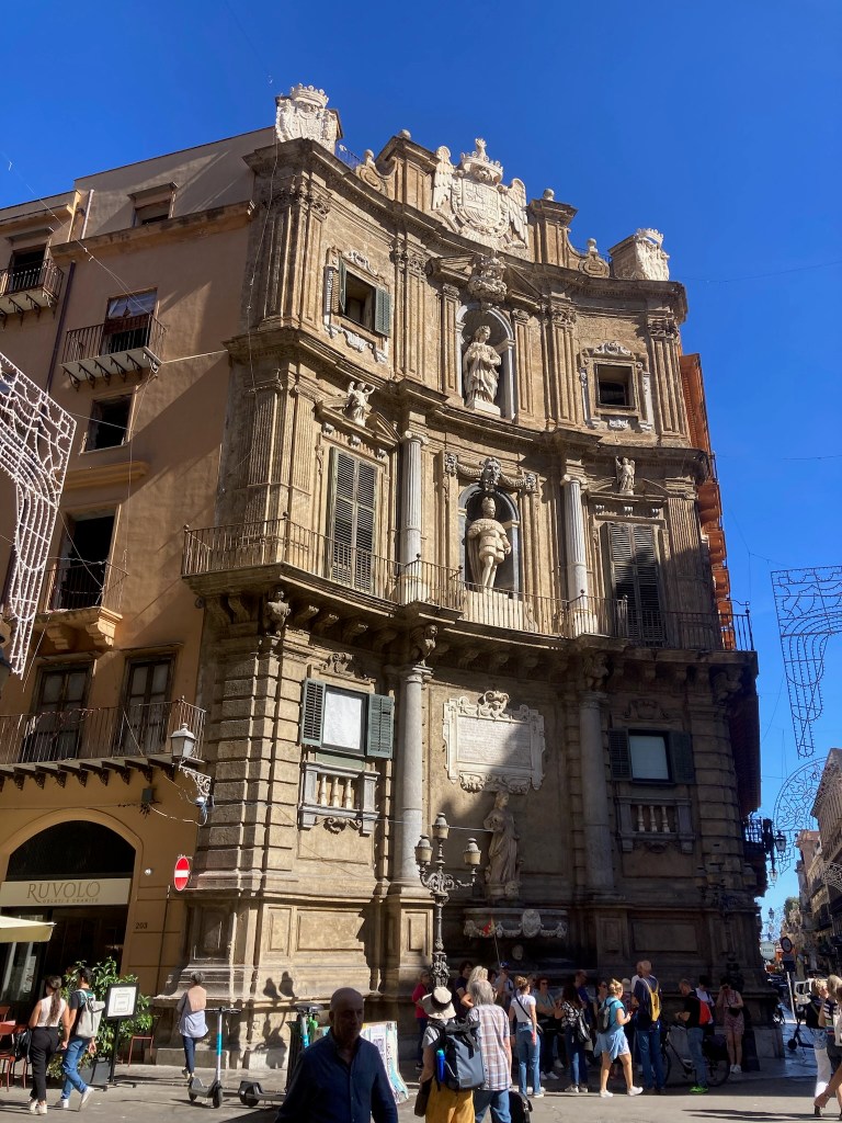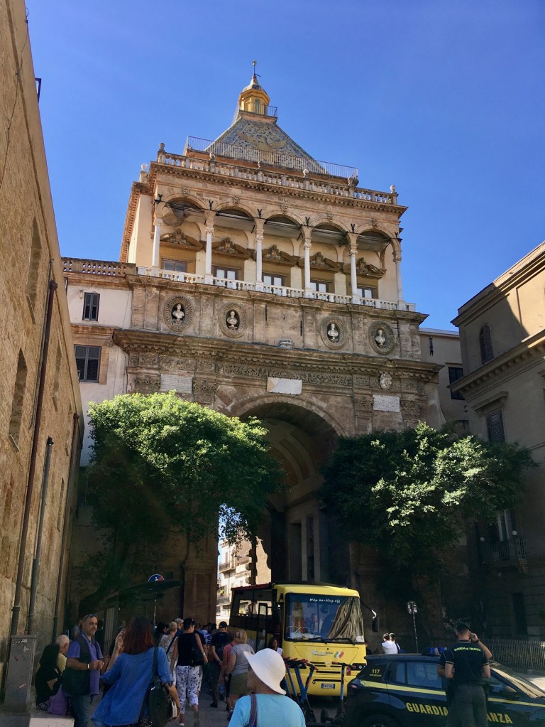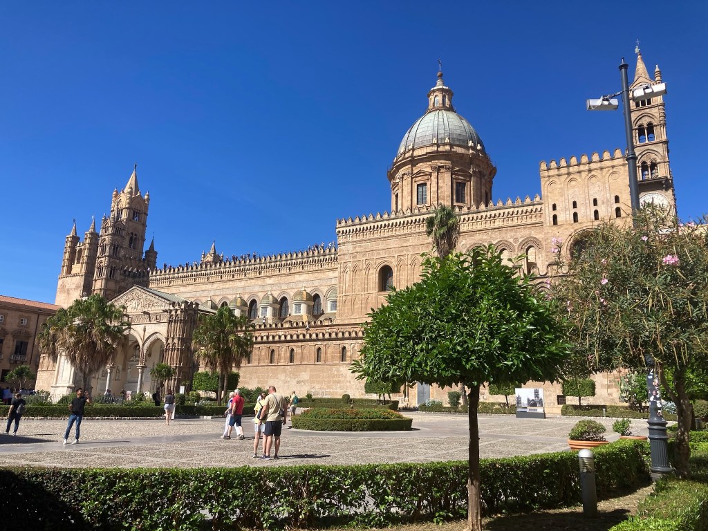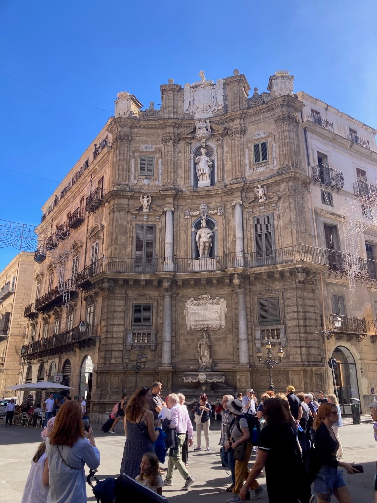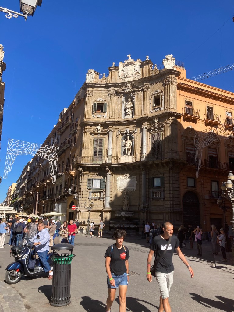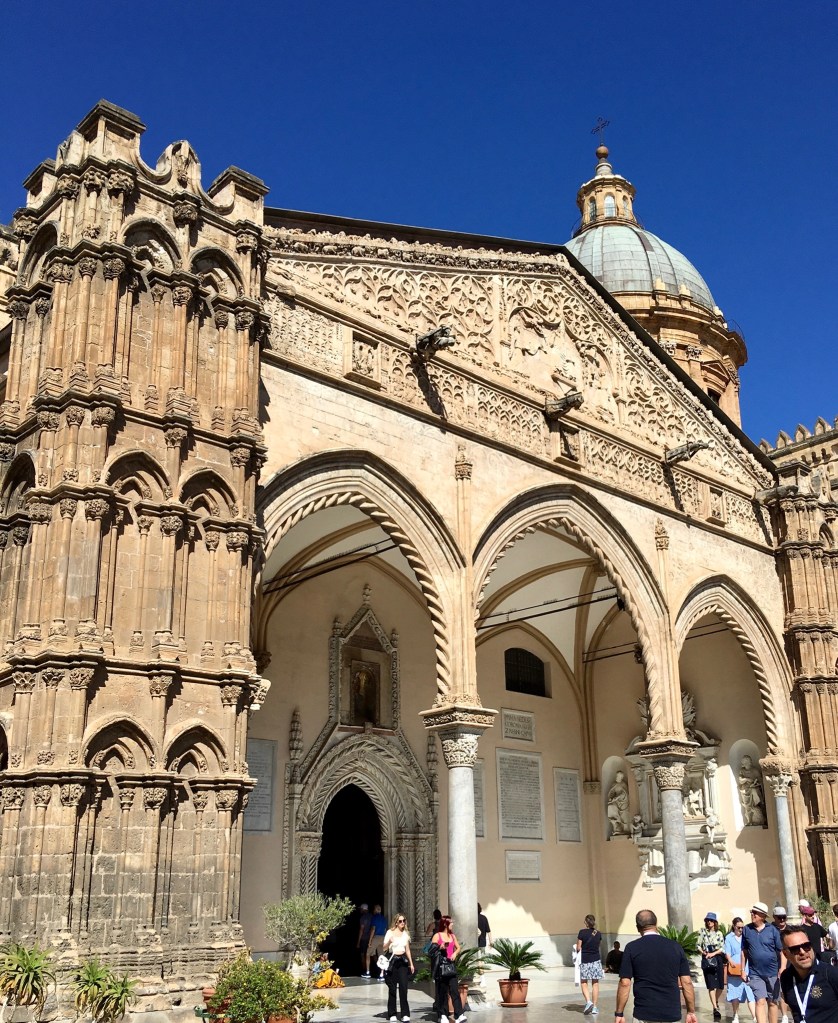 From a bit of research there were a number of “tourist sites” well worth seeing in Palermo and the railway station delivered us to the centre of the Port City and capital of Sicily. We emerged into the Piazza Guilio Cesare to a noisy, dirty greeting and so continued our visit there. To its credit a chunk of the centre is largely pedestrianised thus safe from most traffic and very busy with tourists. The Port is a Cruise Ship destination and a couple were in when we visited depositing several thousand customers, eager to sample what Palermo has to offer. It is most probably just a lack of money, but the centre of Palermo with historic buildings like the Quattro Canti – “famous symmetrical square and fountains “, was desperate for a careful waterblasting!!