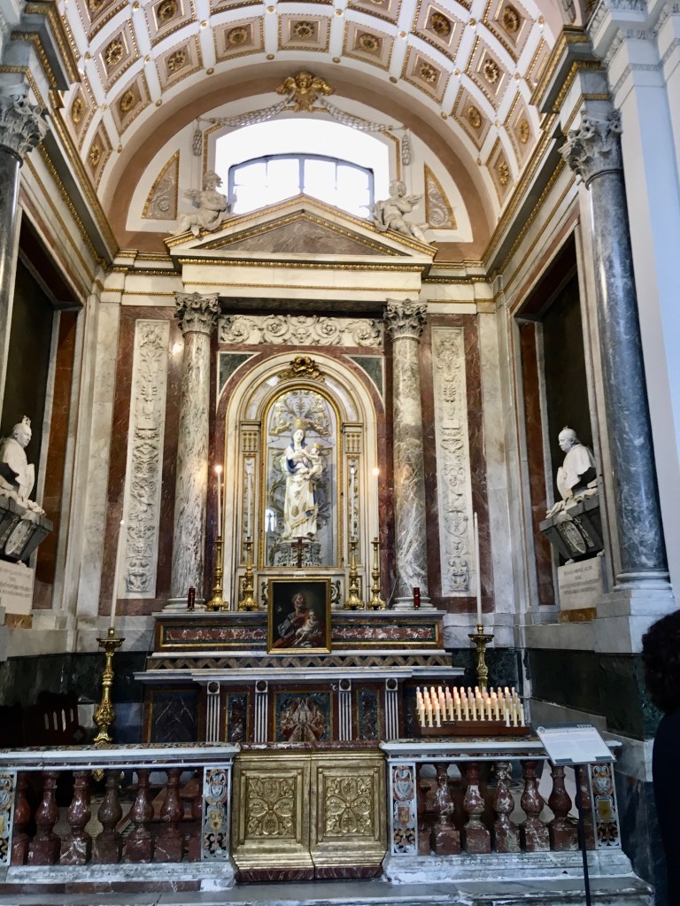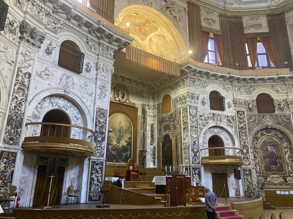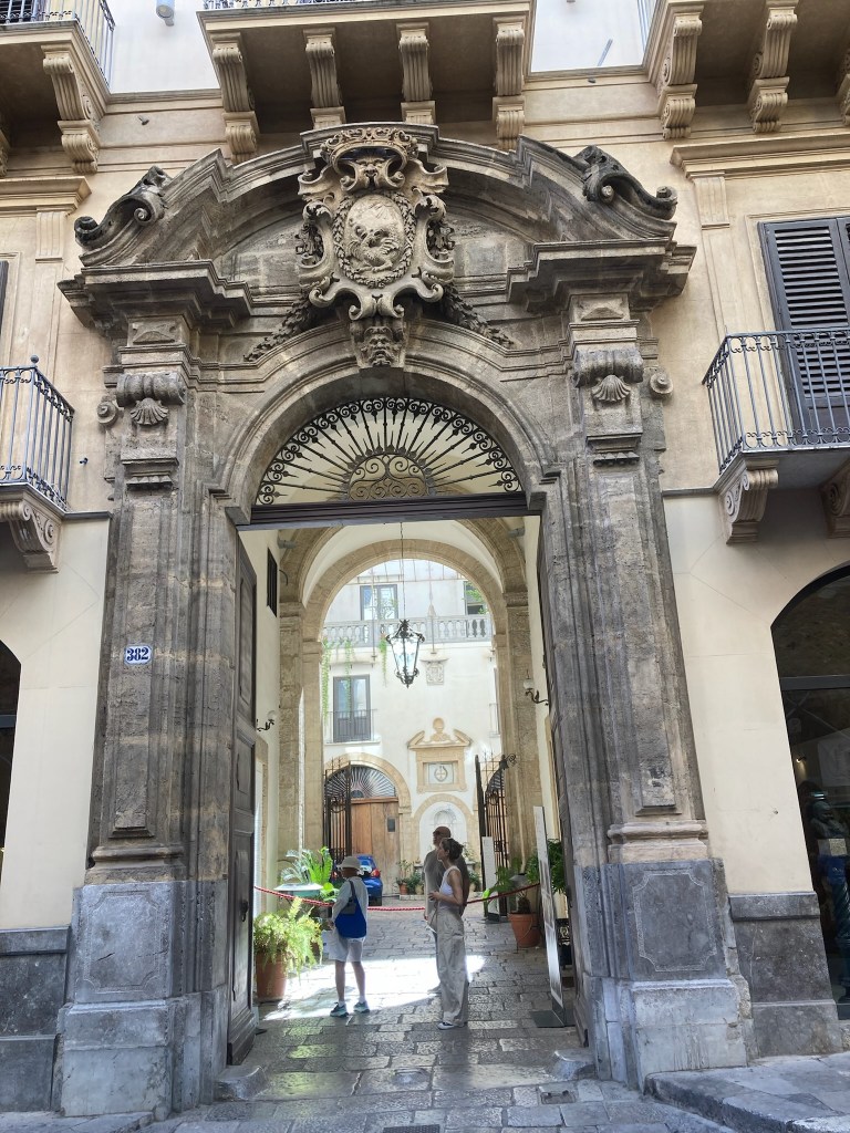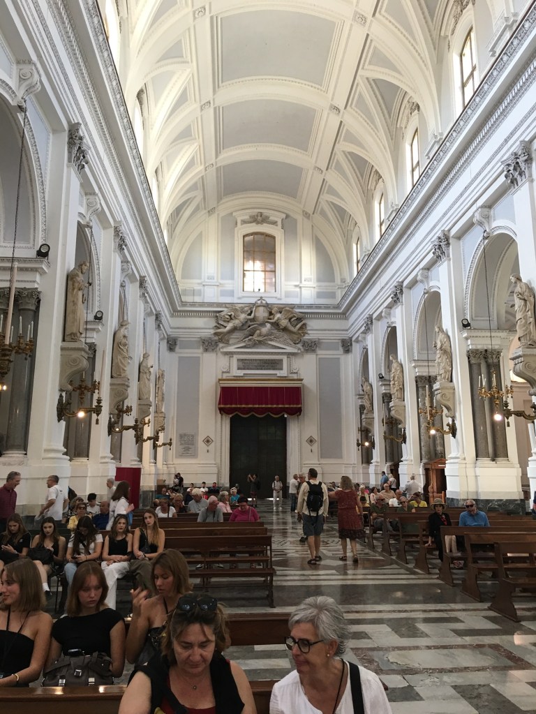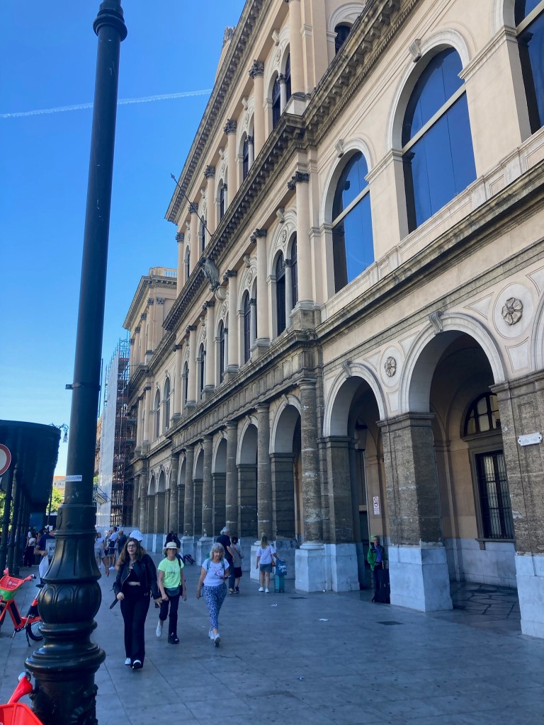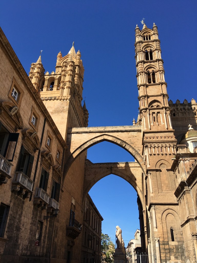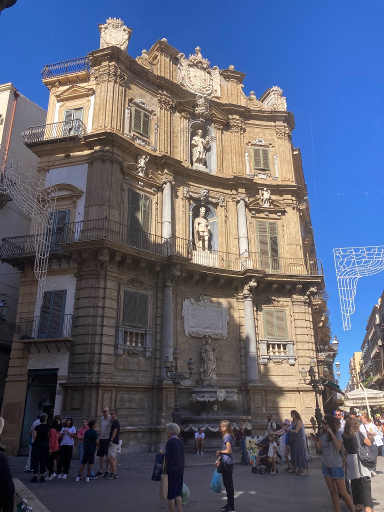 From a bit of research there were a number of “tourist sites” well worth seeing in Palermo and the railway station delivered us to the centre of the Port City and capital of Sicily. We emerged into the Piazza Guilio Cesare to a noisy, dirty greeting and so continued our visit there. To its credit a chunk of the centre is largely pedestrianised thus safe from most traffic and very busy with tourists. The Port is a Cruise Ship destination and a couple were in when we visited depositing several thousand customers, eager to sample what Palermo has to offer. It is most probably just a lack of money, but the centre of Palermo with historic buildings like the Quattro Canti – “famous symmetrical square and fountains “, was desperate for a careful waterblasting!!