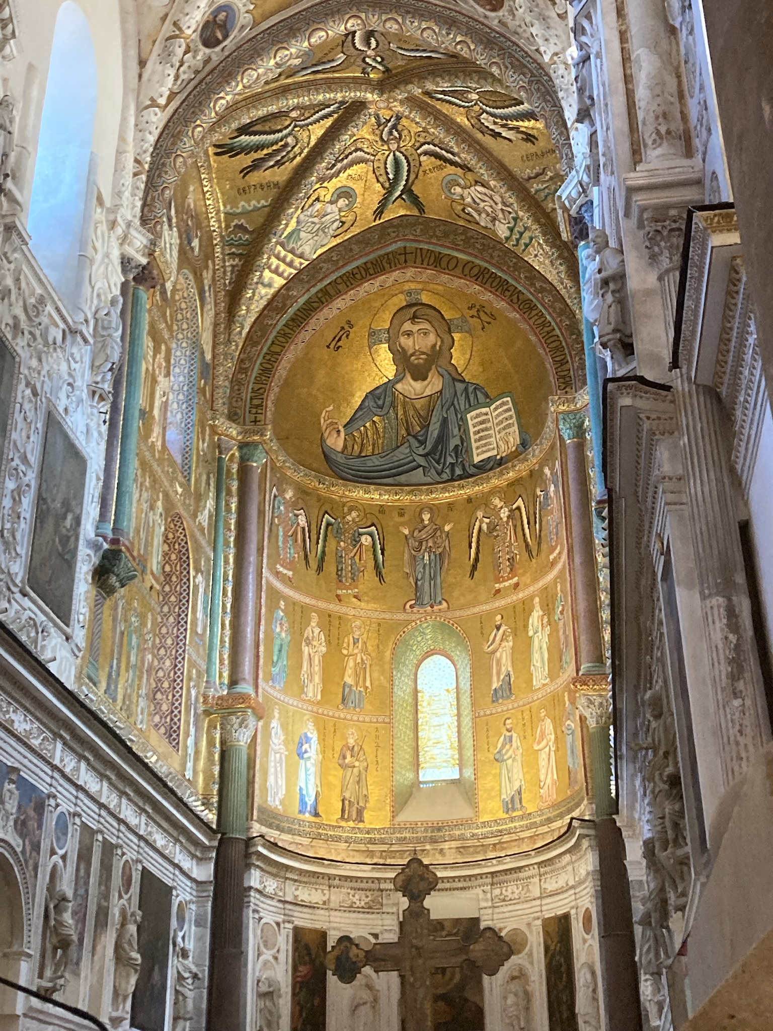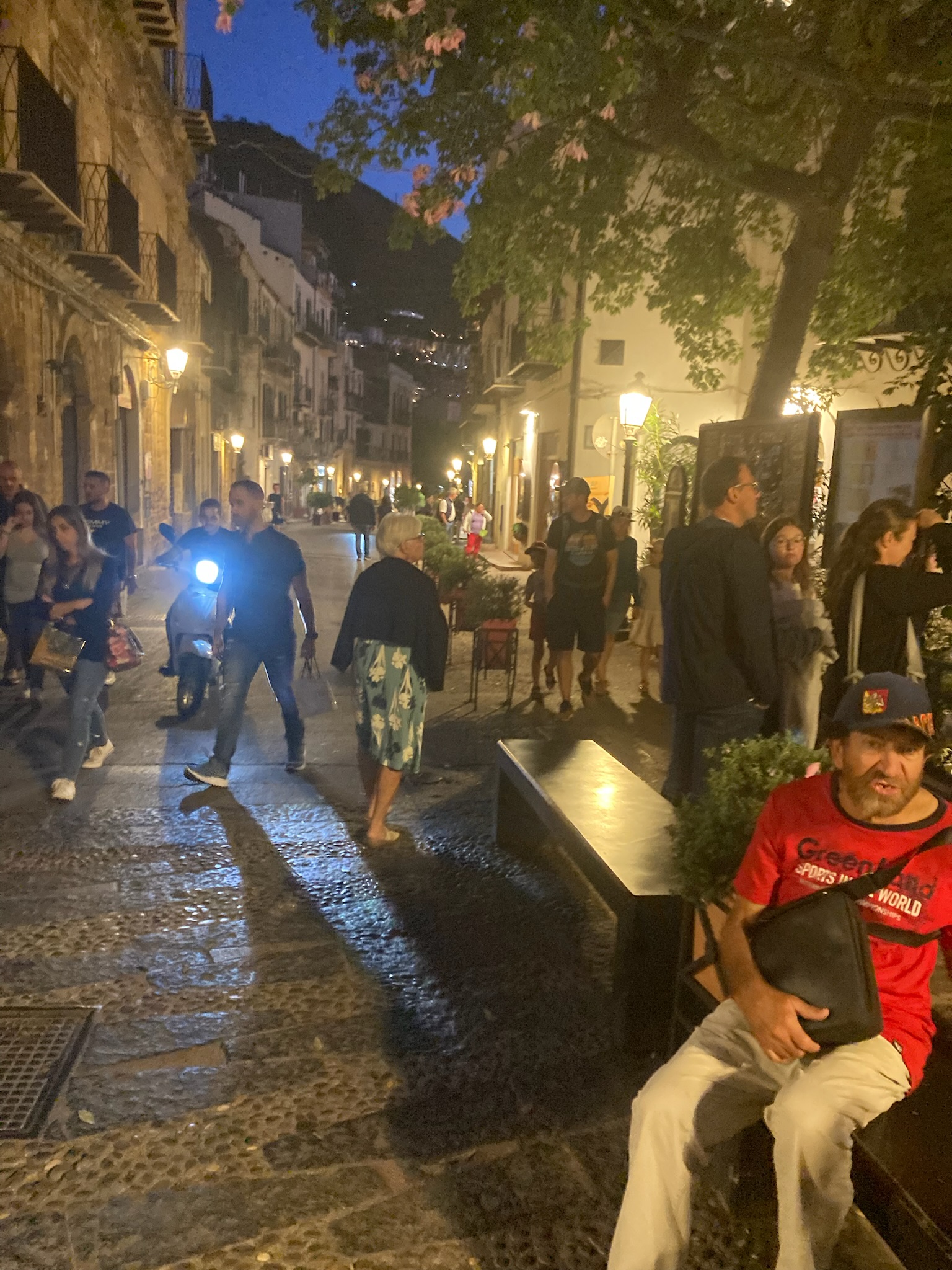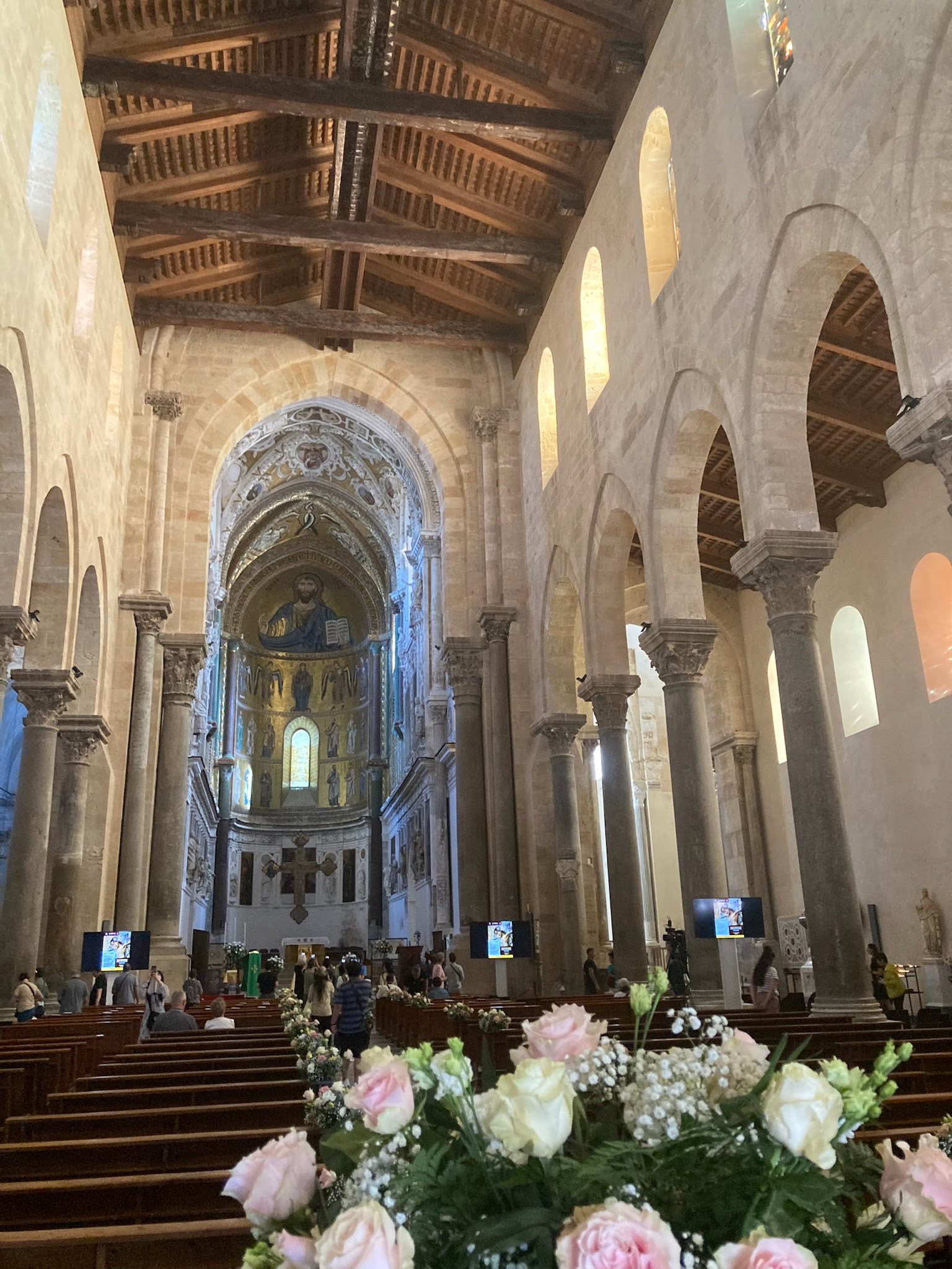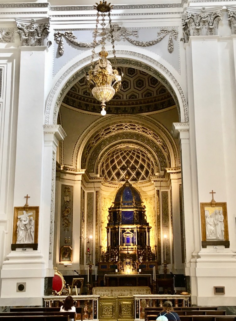But back to Cefalu and with the weekend upon us, we headed to the town to explore. Dominated by the Duomo and the Rocca de Cefalu the town with its beach, even when busy with tourists as it was, is just lovely. The Duomo even had a wedding for us to watch the guests, bride and groom arrive for as we ate ice cream and “people watched”. The Duomo is imposingly beautiful, inside and out with the narrow clean surrounding streets fun to wander around. We had a lovely supper overlooking the surrounding Mediterranean, watching the sunset, quite romantic until the waiter tipped Sue’s glass of water over the table – oops!!