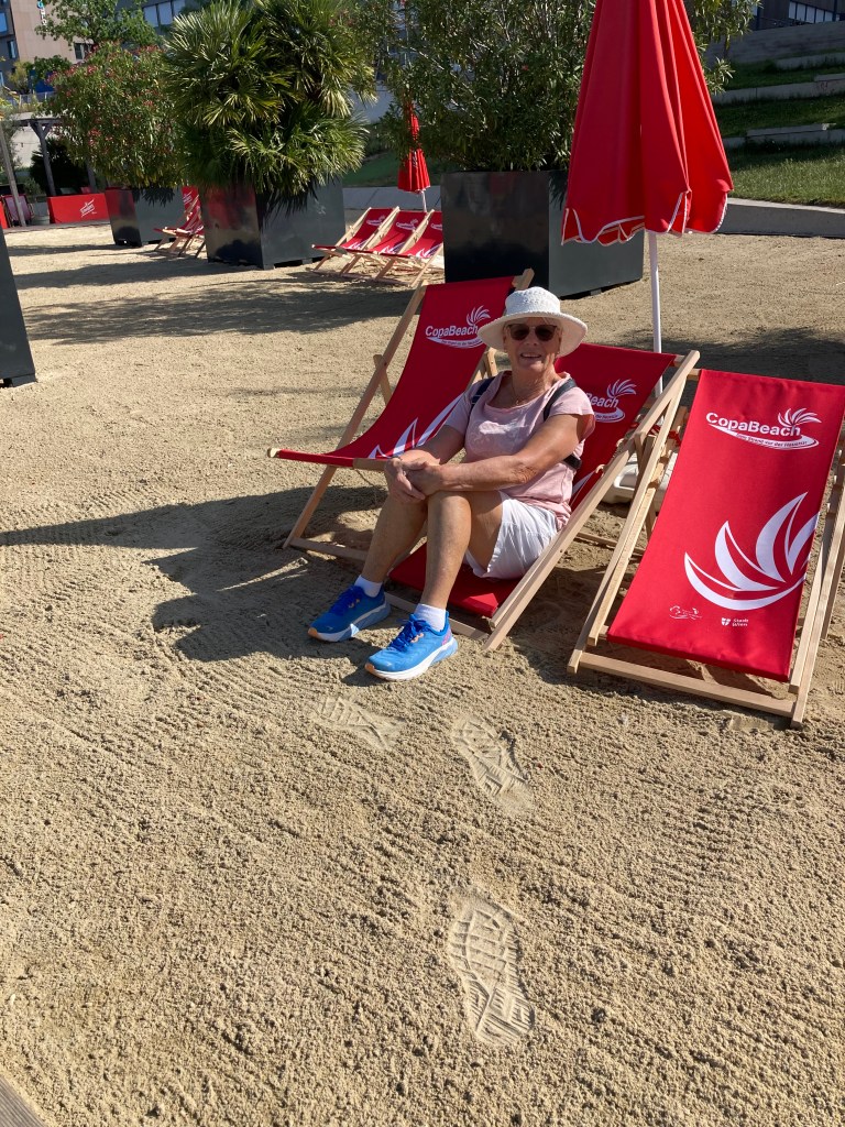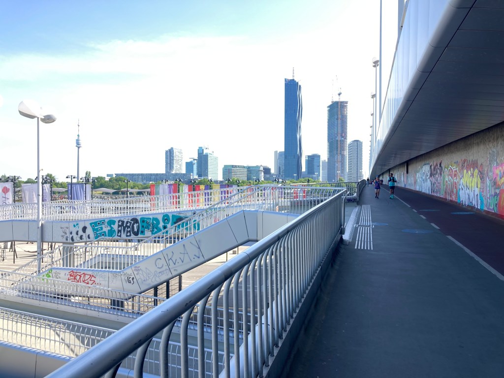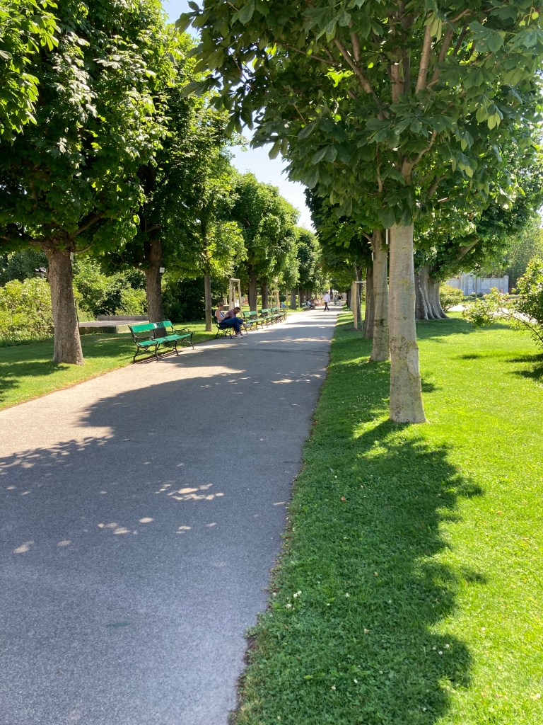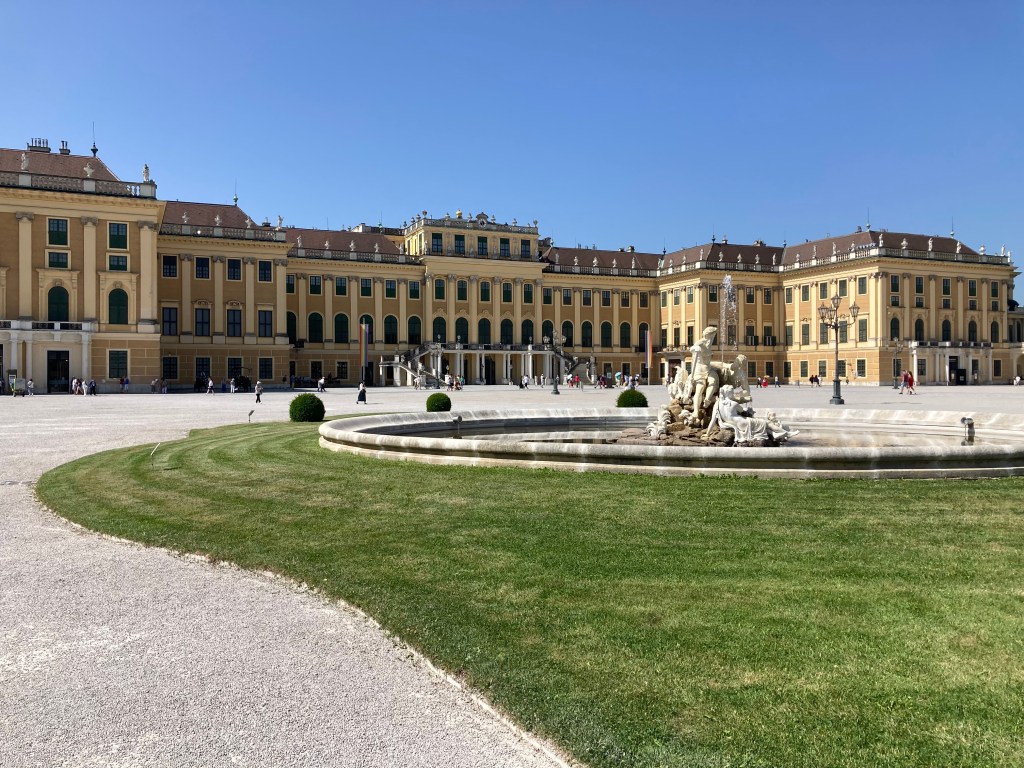 Our apartment is not air conditioned, nor are there any fans, a feature we are missing badly, so Day 2 is all about getting out early before the sun is too hot! We take two Ubahns and get deposited on the north side of the Danube and its adjacent canal, so that we can walk back across them heading into the city and eventually on to our principle destination, the Schonbrunn Palace. North of the Danube stand modern quite stunning buildings, apartments and office premises side by side. As we walk along the Danube, three intrepid swimmers are taking a dip – no obvious information on water quality is visible!! We agree they are brave. Sue finds a manufactured “Copa Beach” beside the river, then we head across both the Danube and its Canal, pausing to take in the colossal “River Cruise Vessels”, which we see advertised so much.