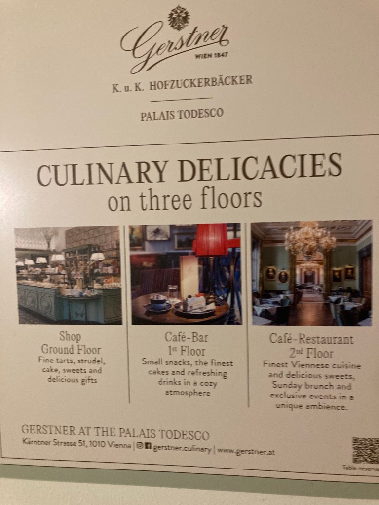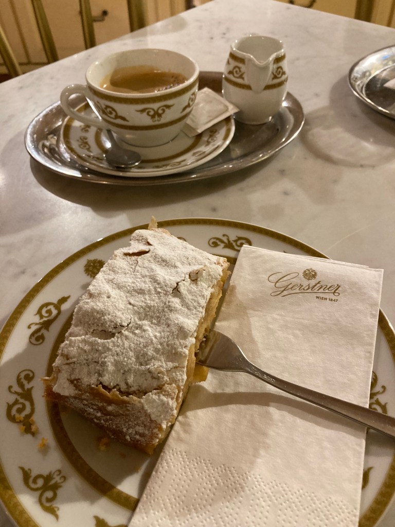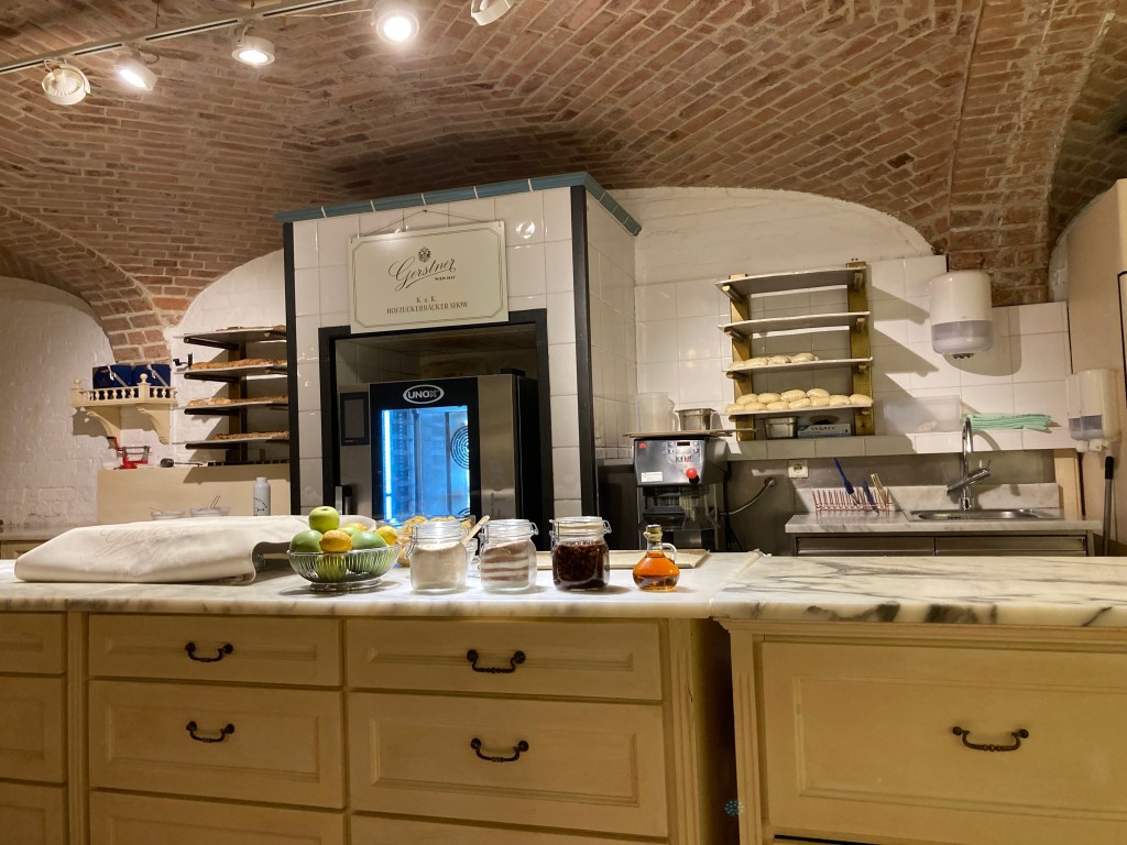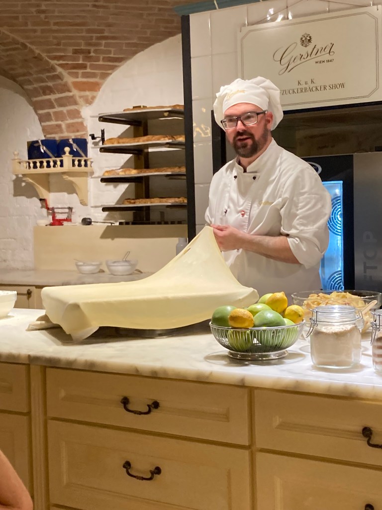 Along with a Schnitzel and Kaiserschmarrn, all “national dishes’!! We are here in a wing of the Schonbrunn Palace to see an “Apfel Strudel Cooking Show, thank you Carol from tennis for the brilliant recommendation. Included a chance to sample – mmmm delicious and great coffee!!